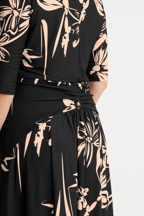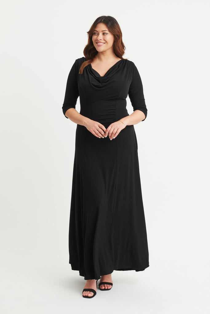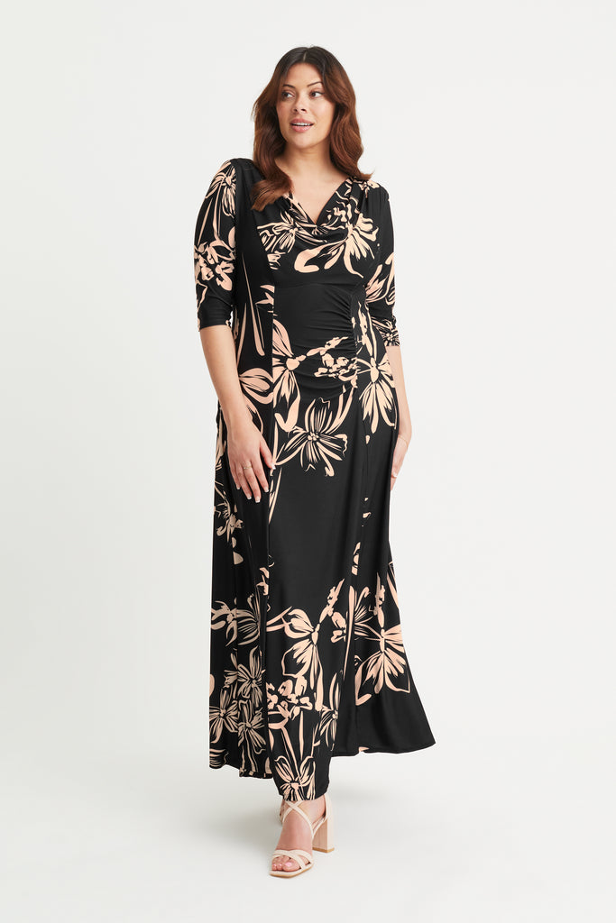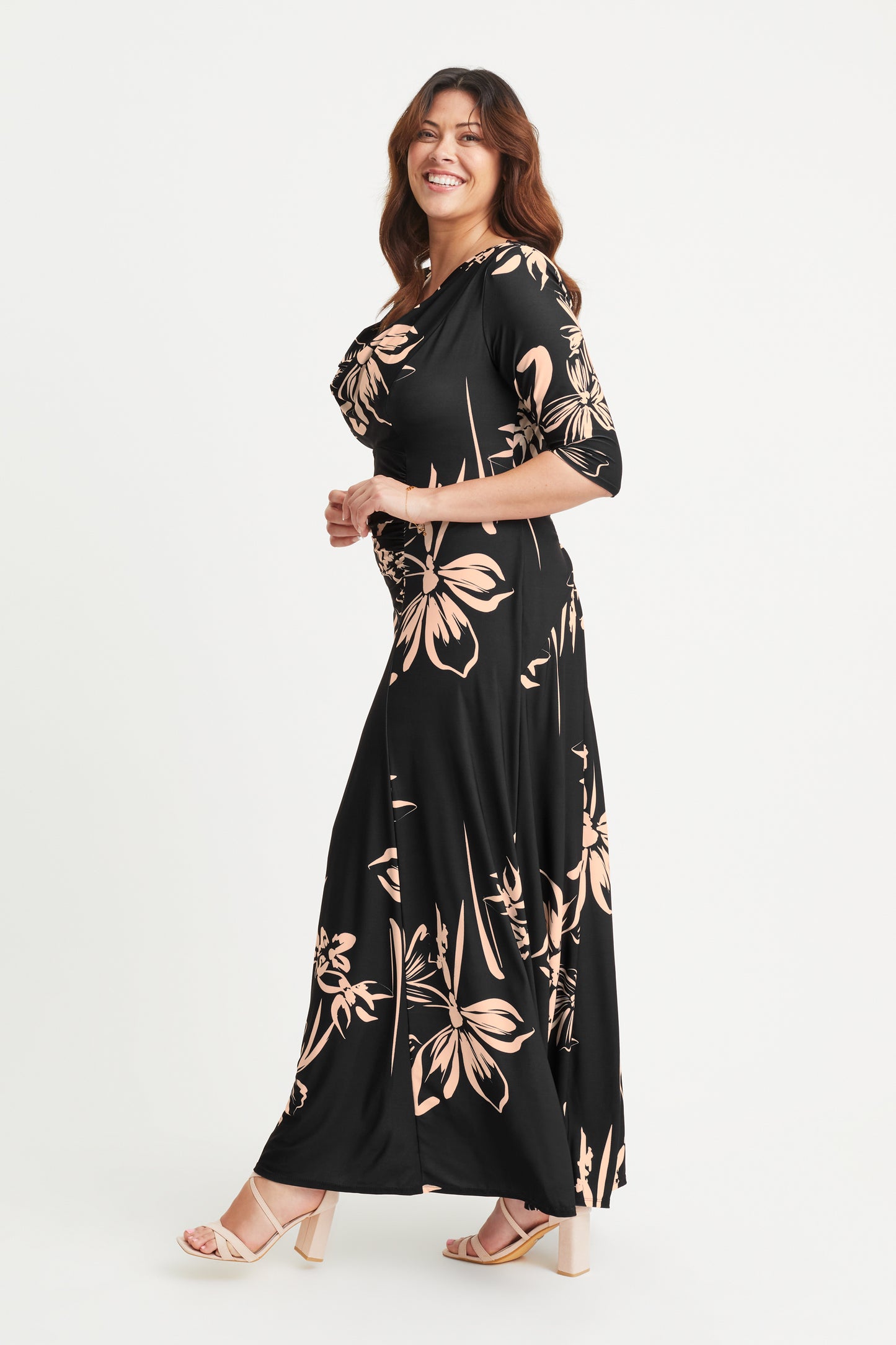 Black Cream Cowl Neck Maxi Gown with Ruched Bustle Back