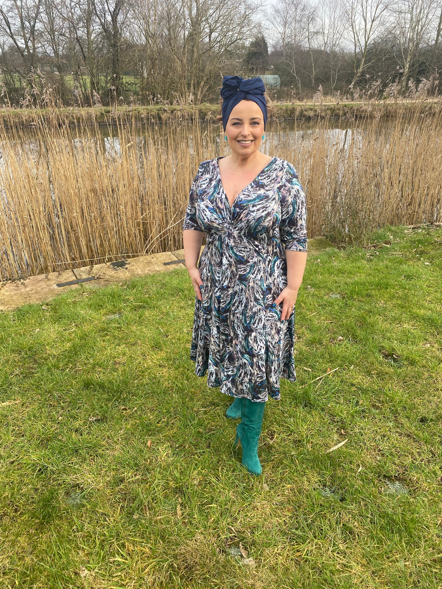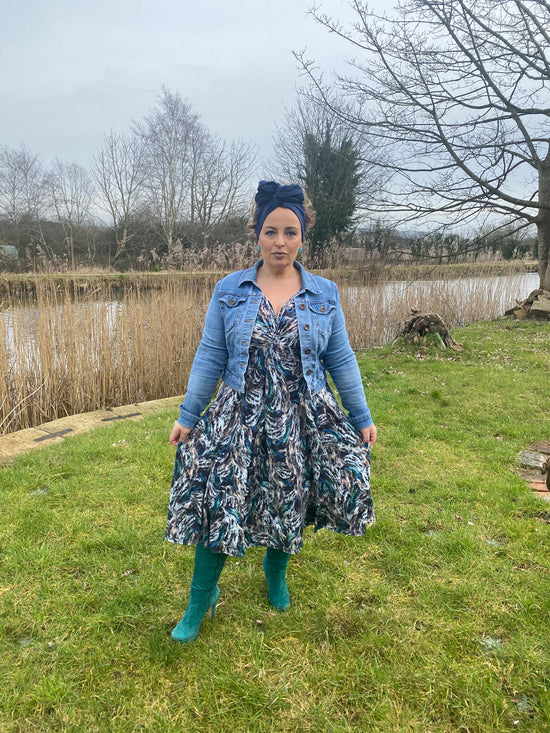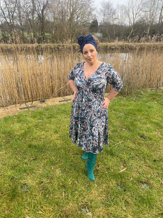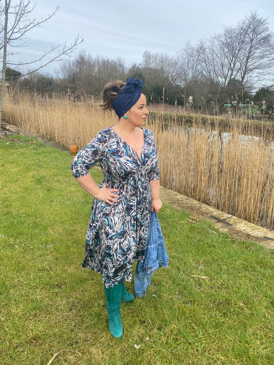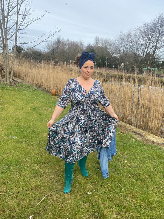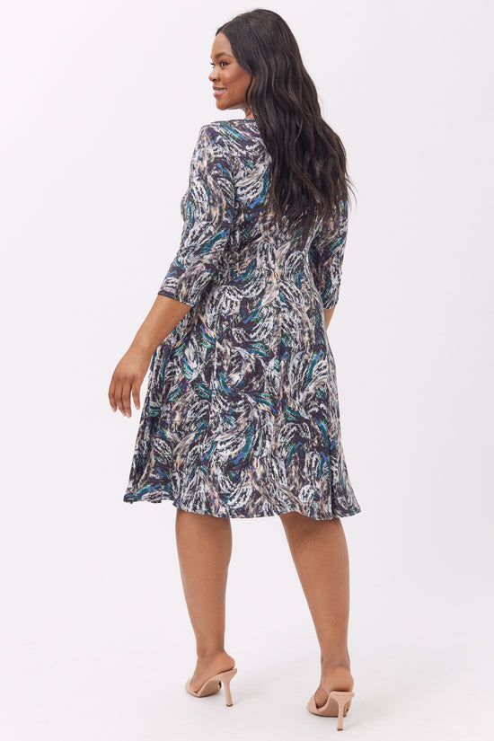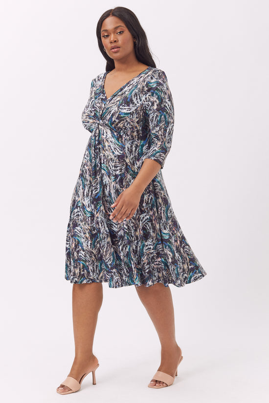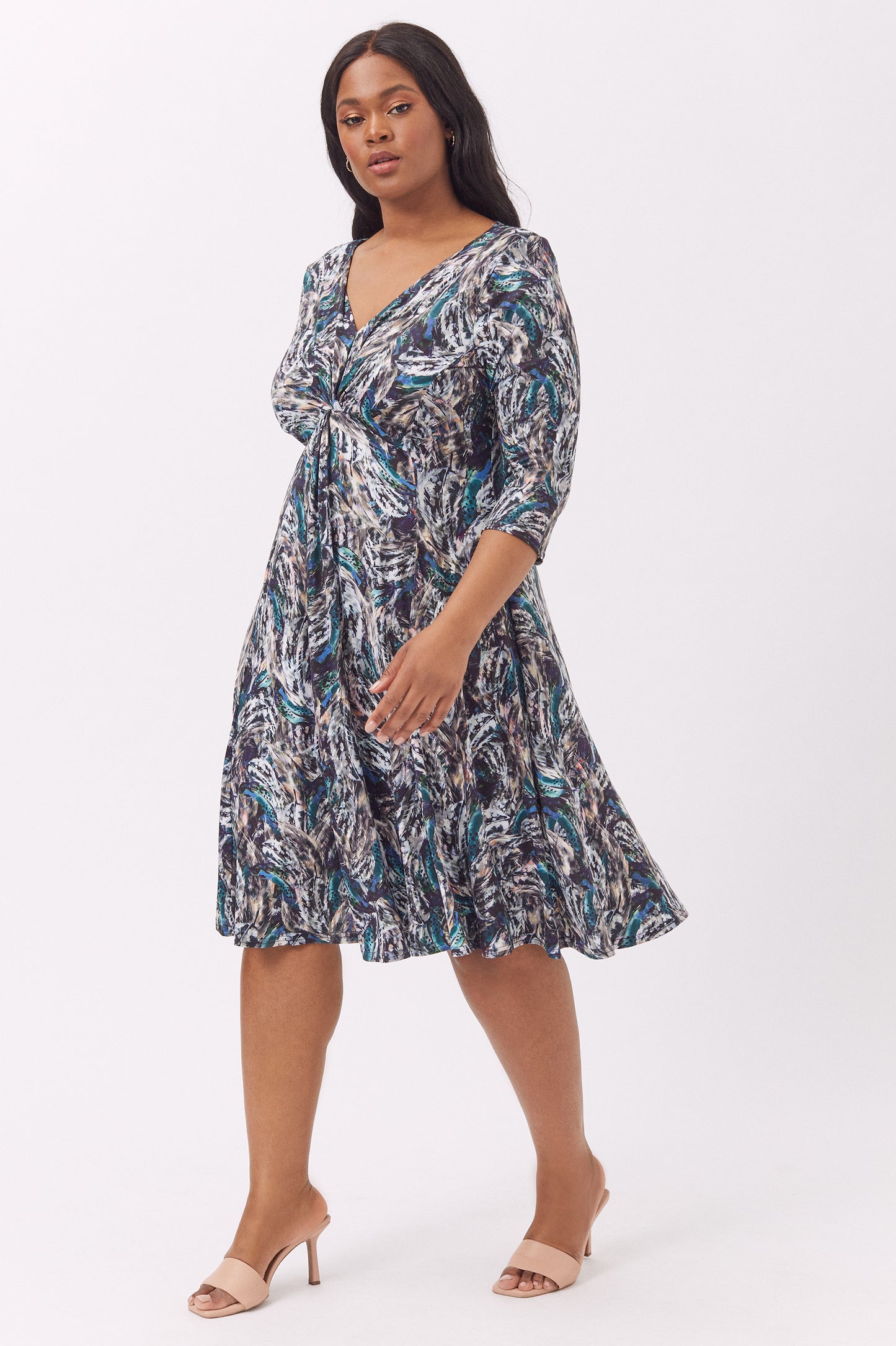 Elevate your seasonal wardrobe in this form-flattering fit and flare dress. Designed in a super soft 'peach touch' print  stretch fabric. This piece boasts a beautiful knot front detail and a swishy skirt for added movement. Falls to a mid-length with ¾ sleeves, v neck and princess seams for shape. There are detachable shoulder pads per your preference.