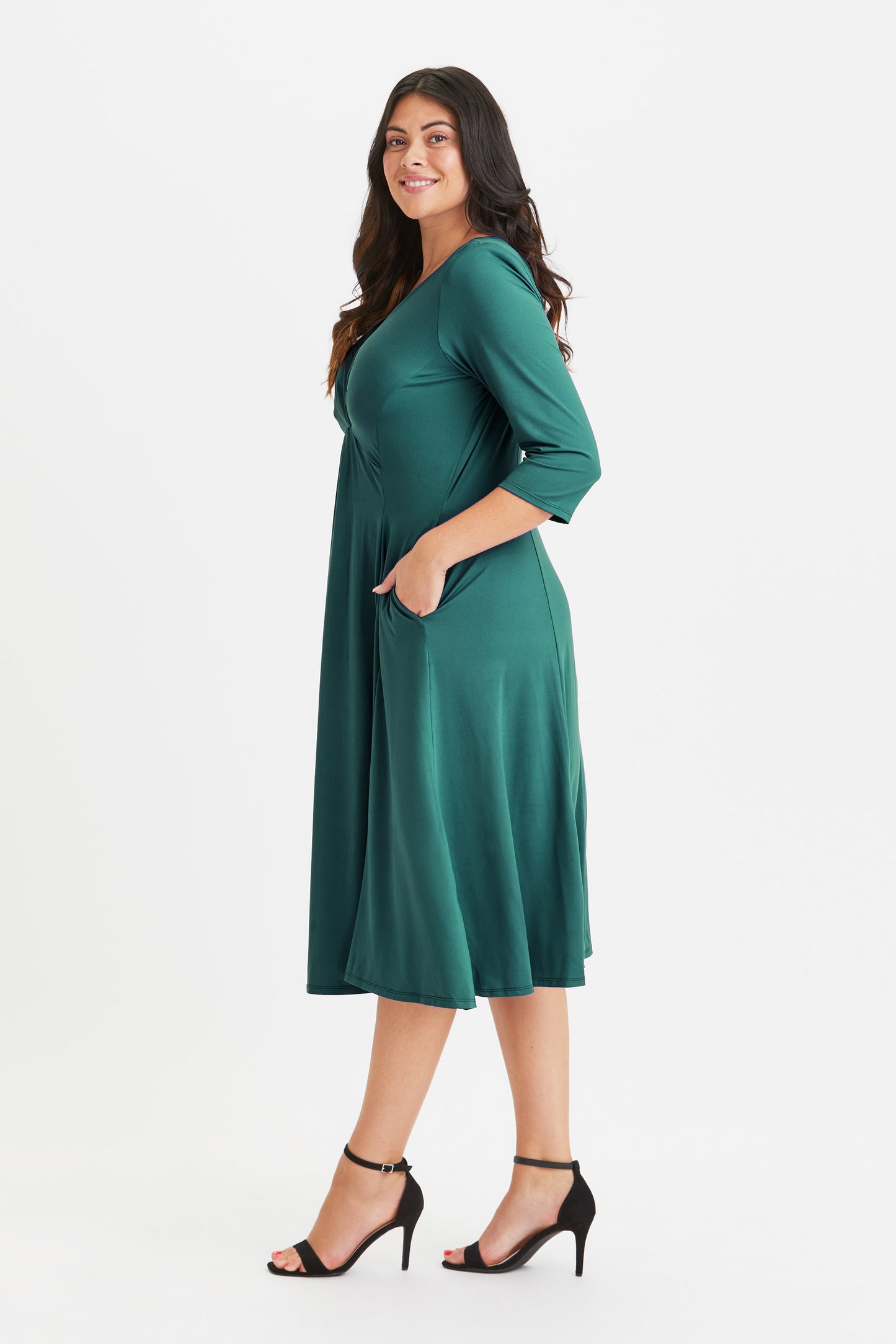 Pure comfort and confidence emanates from this version of the Scarlett & Jo classic form-flattering fit and flare midi dress. Crafted in a super soft POWERFIT® peach touch jersey fabric, this iconic piece boasts a beautiful knot front detail and a fit and flare flowing skirt for added movement. Falling to a mid-calf midi length with ¾ sleeves, v neck and princess seams for shape this dress includes side pockets. The dress also has small detachable shoulder pads to elongate your shape.