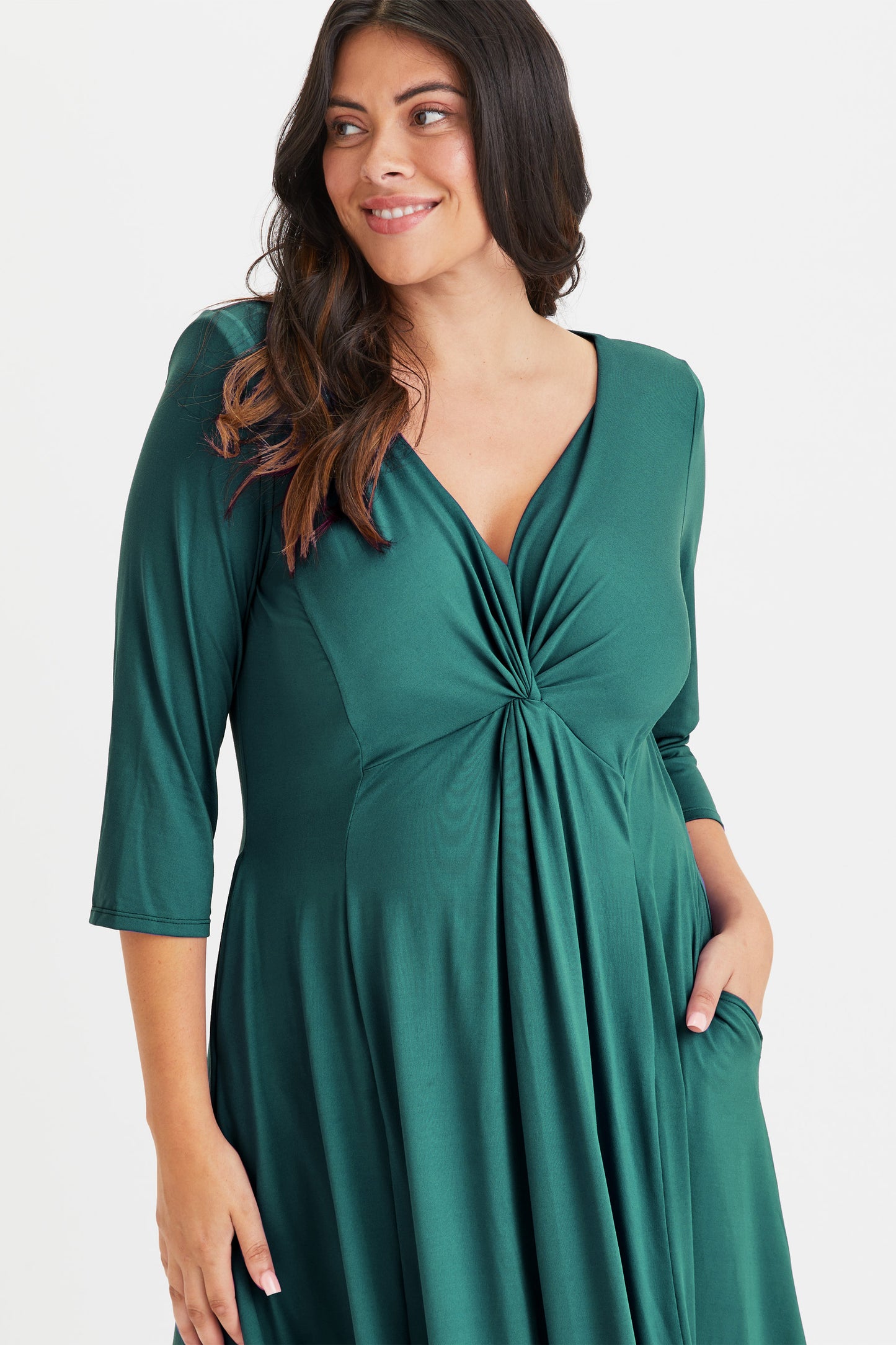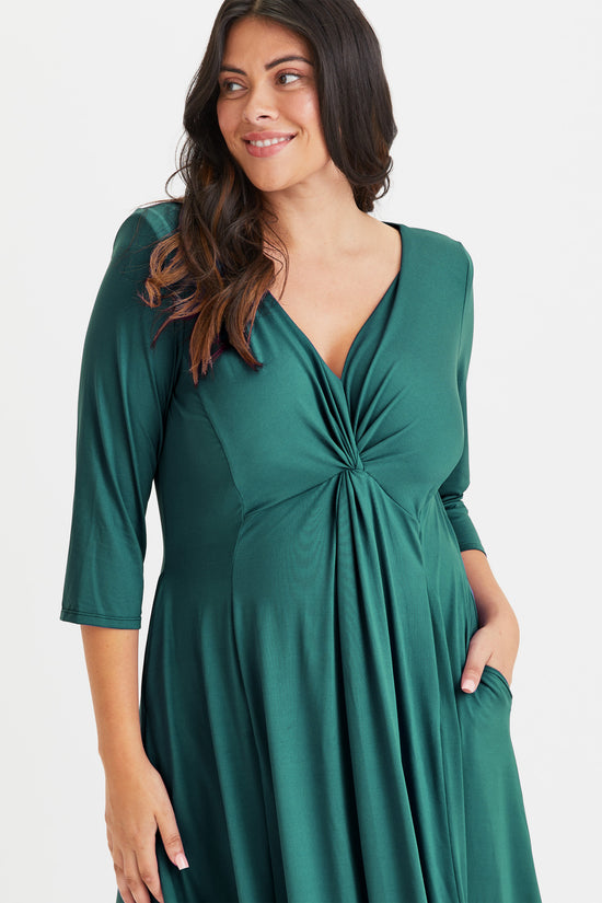 Claudia Dark Green Peach Touch Jersey Knot Front Dress