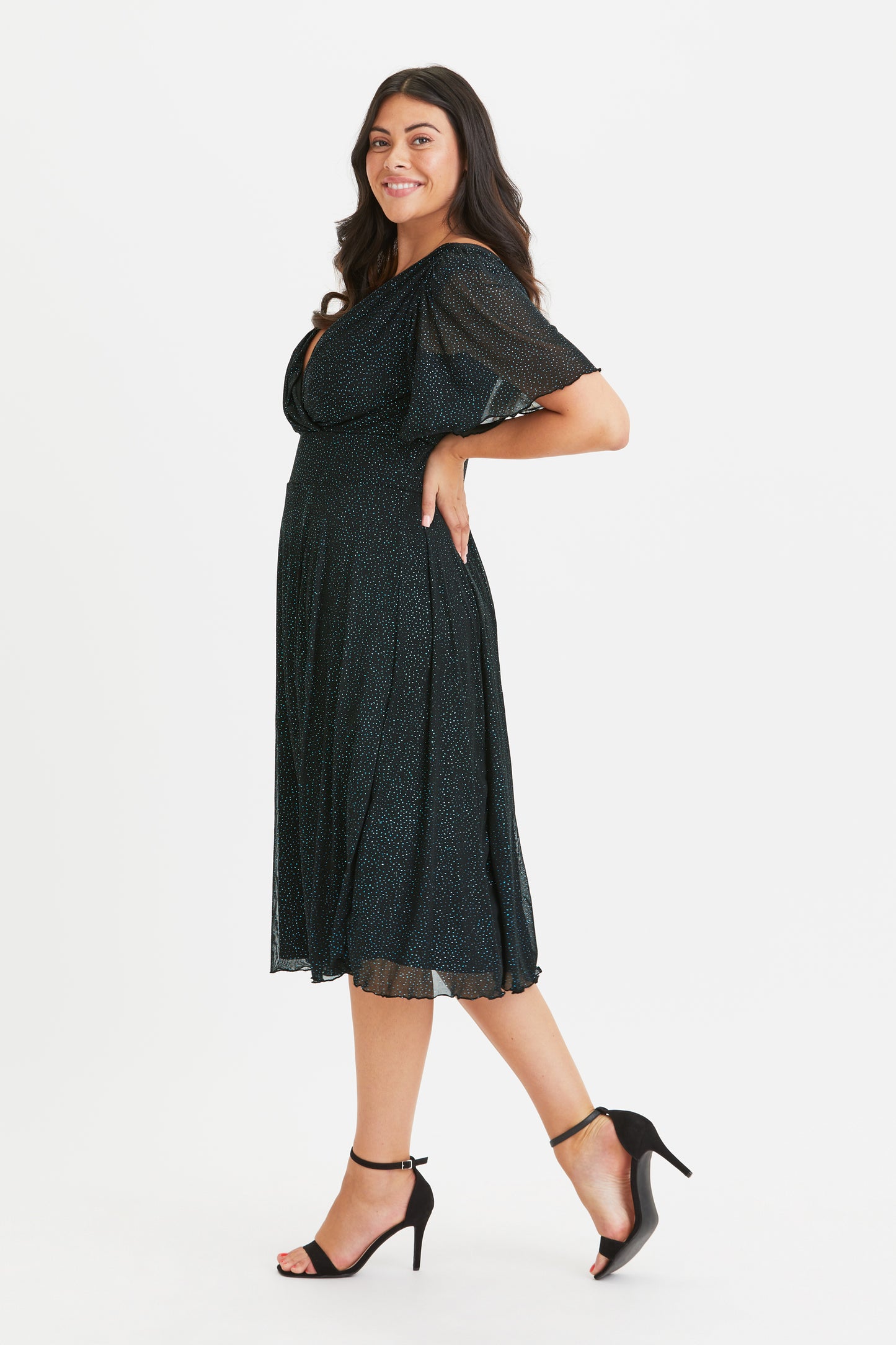 This Angel Sleeve Midi Dress is made in a super soft stretch POWERFIT® mesh featuring  an all over blue glitter on black. The fabric breathes. This dress comes with a magic waistband, in-built corset to help accentuate curves and brings out that unique Scarlett and Jo hourglass shape. The deep V wrap-neck creates a flattering feminine silhouette and the angel sleeves provide upper arm coverage. The dress is fully lined and shoulder pads are detachable. This is a perfect dress that you can wear to any event.