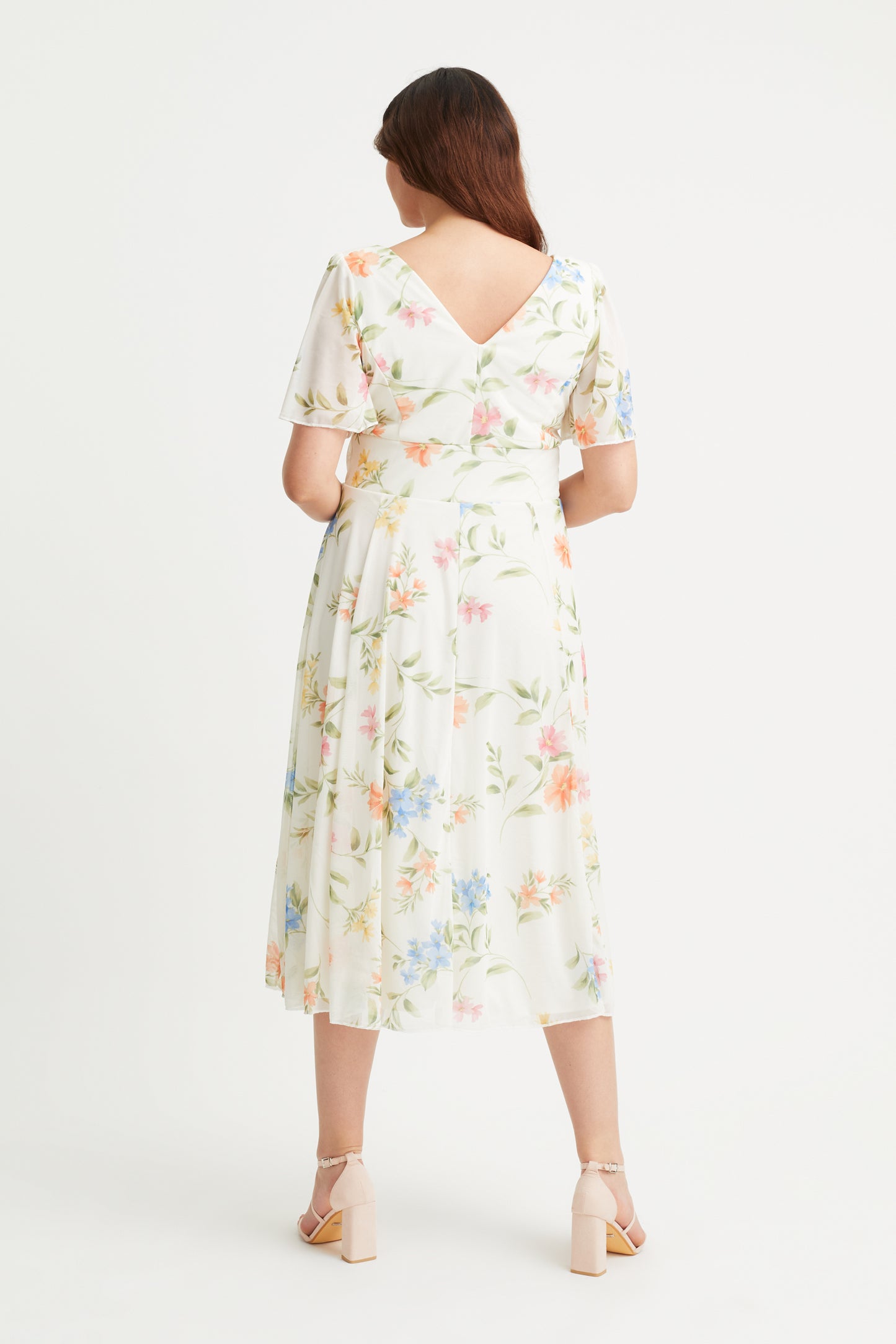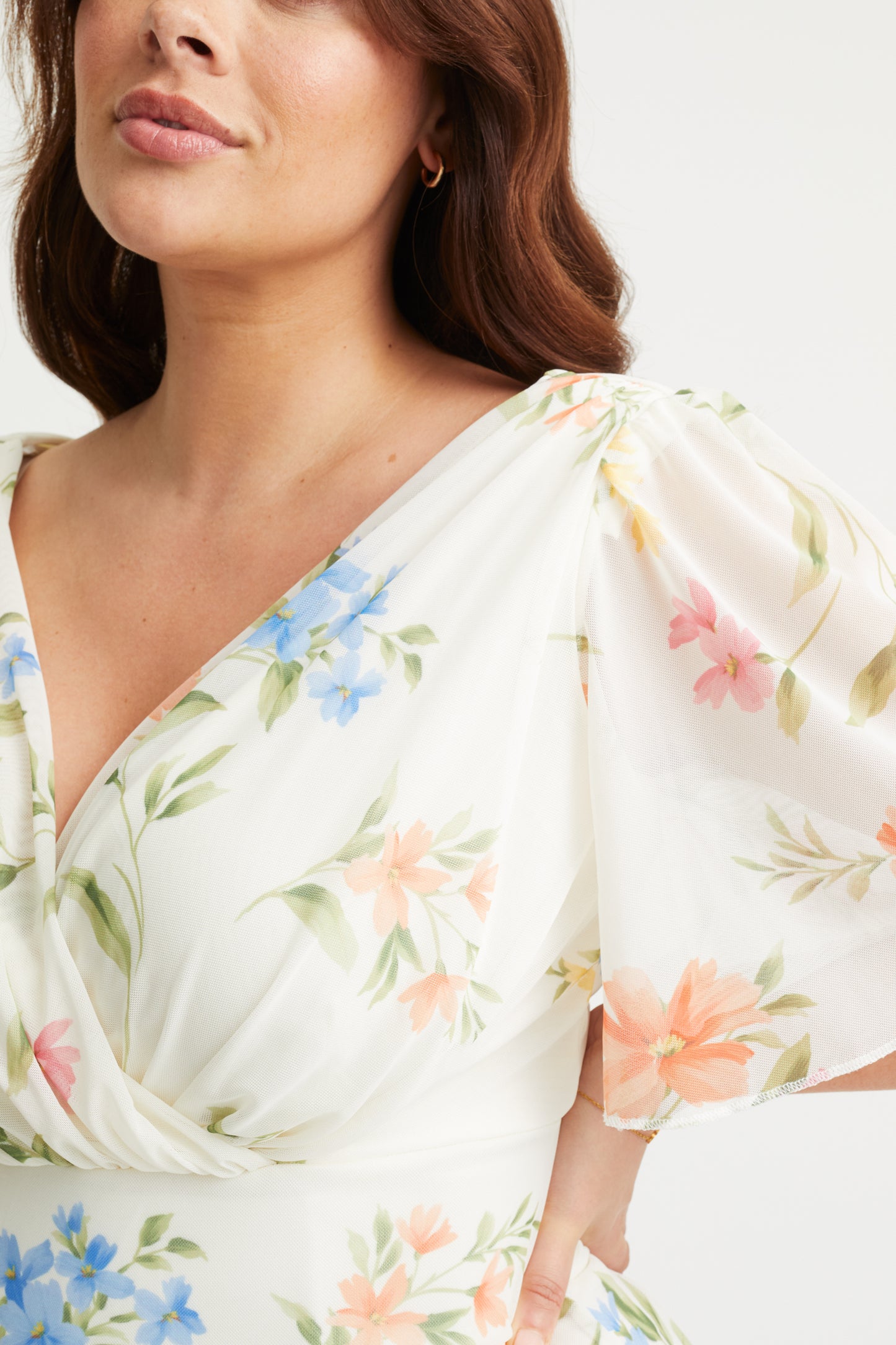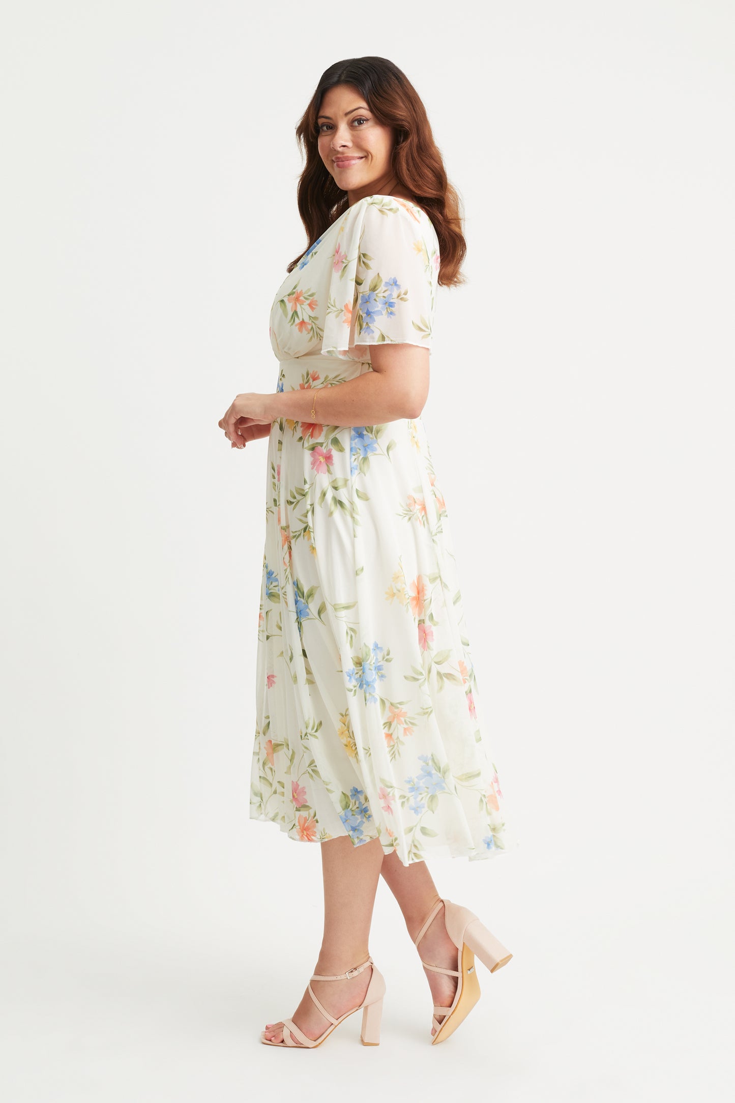 Victoria Cream Multi Flower Angel Sleeve Mesh Midi Dress