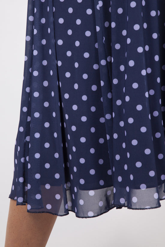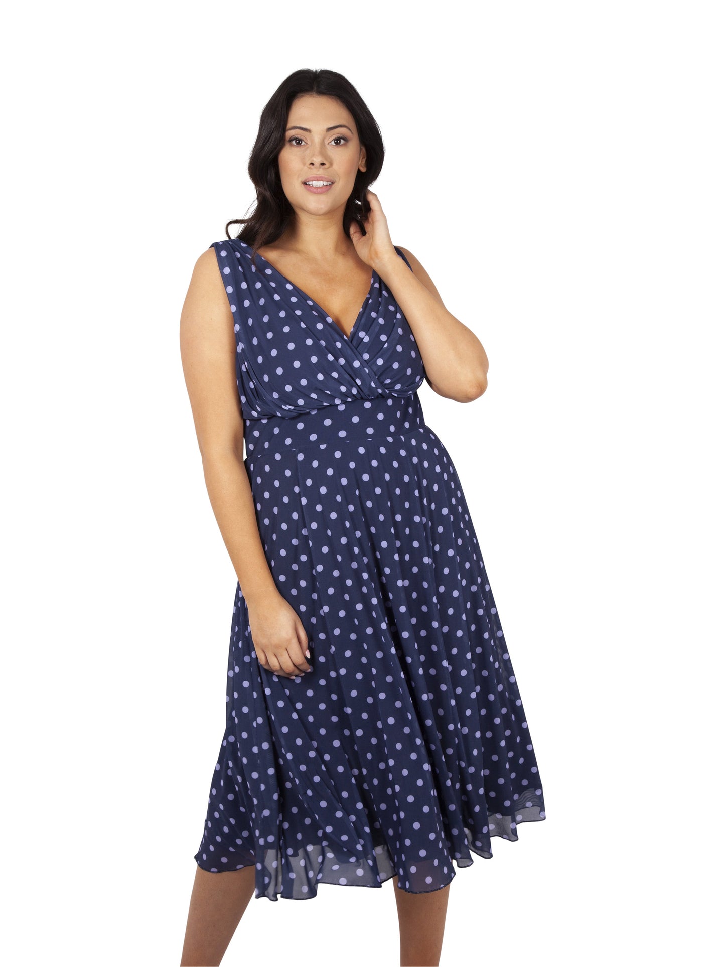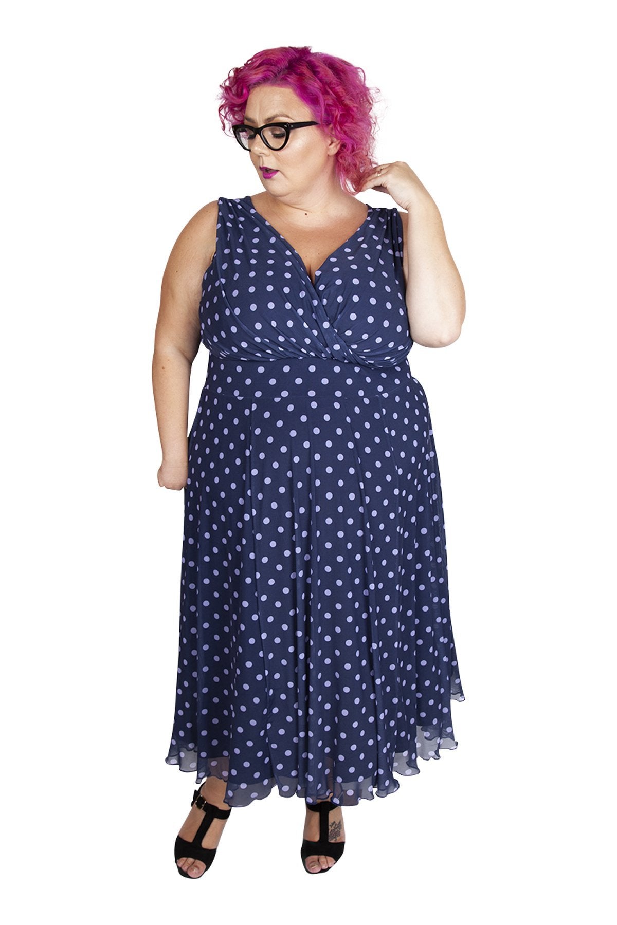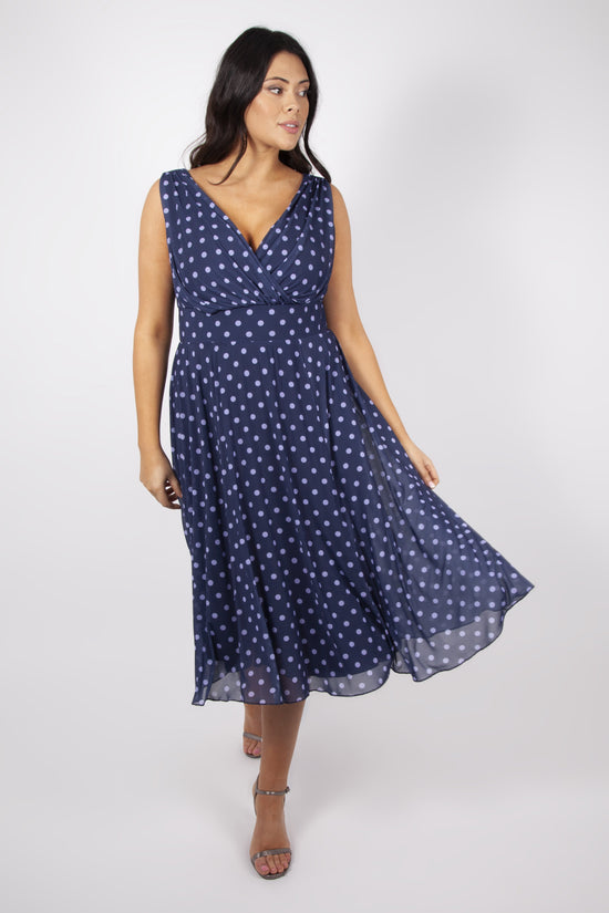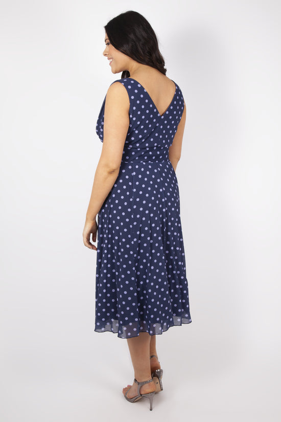 The Freya Blueberry and Lilac Spot Midi Dress will leave hearts head-over-heels. Elegantly shaped, this piece is decorated in a lilac coin spot print on a rich blueberry background. This fully lined dress has a magic band and a full skirt, creating a fluid silhouette. Finished with an appealing v wrap neckline, sleeveless and a demure mid-length.