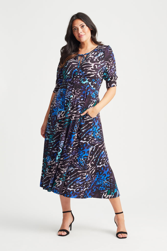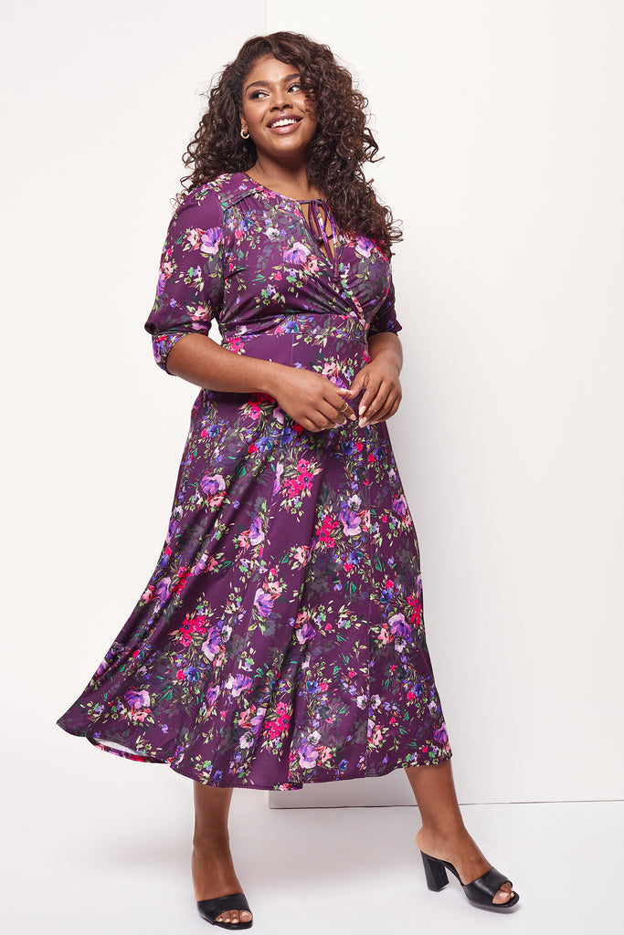 A 1940's inspired dress featuring gorgeous wrap neck line with ties. This beautifully tailored dress is mid calf length with details within the silhouette to flatter your figure. This is a really flattering dress shaped in a beautiful super "peach touch" POWERFIT® flowing jersey. The print is divine, and moves much in keeping with the silhouette. Perfect for day or night, any time of year! Features include ties at wrap neck, gathered shoulder yoke, detachable shoulder pads, set in 3/4 length sleeves, tie waist band, and full swishy skirt.