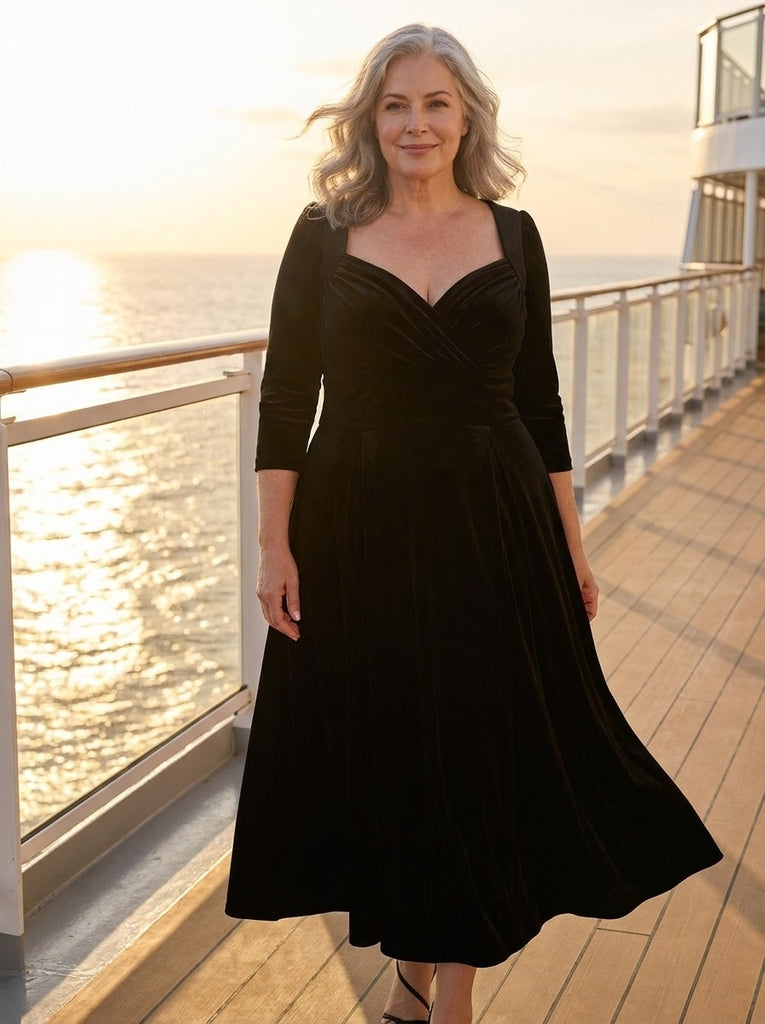 The Elizabeth Velvet Maxi Gown features a gorgeous, daring low-cut, wrap bodice adorned by a super soft stretch POWERFIT® velvet. Featuring a full skirt attached to the elasticated MagicBand® that enhances your figure. Perfect for any occasion, you will be comfortable and confident in this  truly sensational evening dress with a secure wrap sweetheart neck and three quarter length sleeves.  Please note there are detachable shoulder pads that elongates as per your preference.