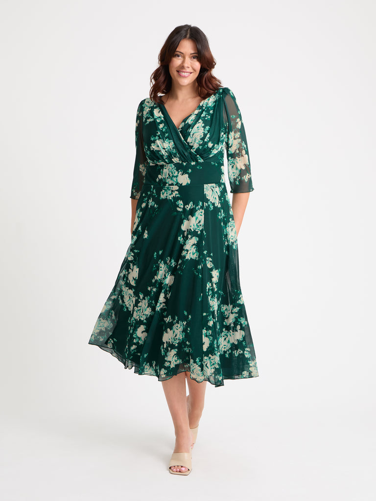 This truly beautiful dress is fully lined and very comfortable to wear. It features a flattering wrap v neck bodice supported by Scarlett & Jo's signature MagicBand® inbuilt waist corset that enhances shape. This gown also features a fully flowing skirt that tapers to swish and swirl. The dress has 3/4 sleeves set into a pretty shoulder line with small detachable shoulder pads, It is a limited edition and is breath-taking as worn. Made  in our POWERFIT® soft and flowy stretch mesh