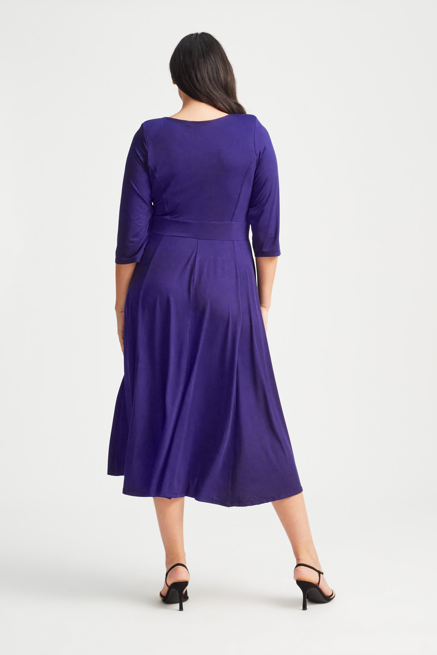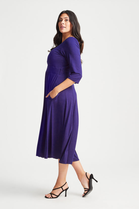 Softly tailored in Scarlett & Jo's POWERFIT® peach touch soft jersey. This V-neck midi dress is smart but casual. So comfortable in wear, this dress can be dressed up or down. This flowing V Neck features a magic waist band corset to enhance the shape. there are handy side seam pockets and a long midi swishy skirt. There are 3/4 sleeves and small detachable shoulder pads that elongate the body. A very comfortable and confident dress.