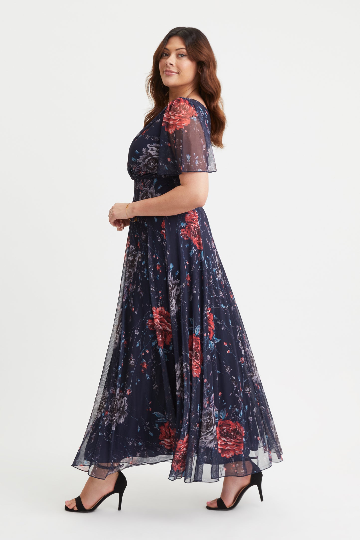 This Isabelle Float Sleeve Maxi Dress features a gorgeous floral print on a predominantly navy background. This dress is made in POWERFIT® soft mesh. Featuring floaty angel sleeves, and a wrap V neckline. The elasticated MagicBand® enhances your figure.  Perfect for any occasion, this is a truly sensational maxi dress. Please note there are detachable shoulder pads that elongates as per your preference.