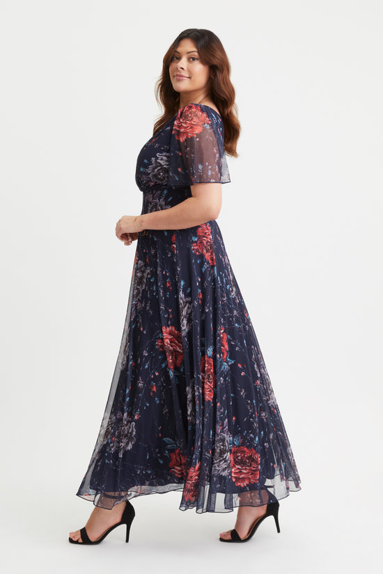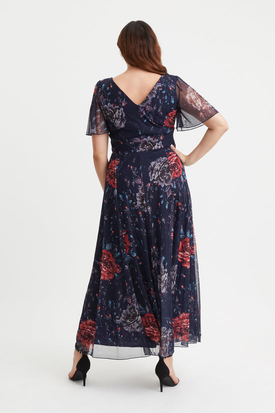 Isabelle Navy Red Rose Float Sleeve Maxi Dress