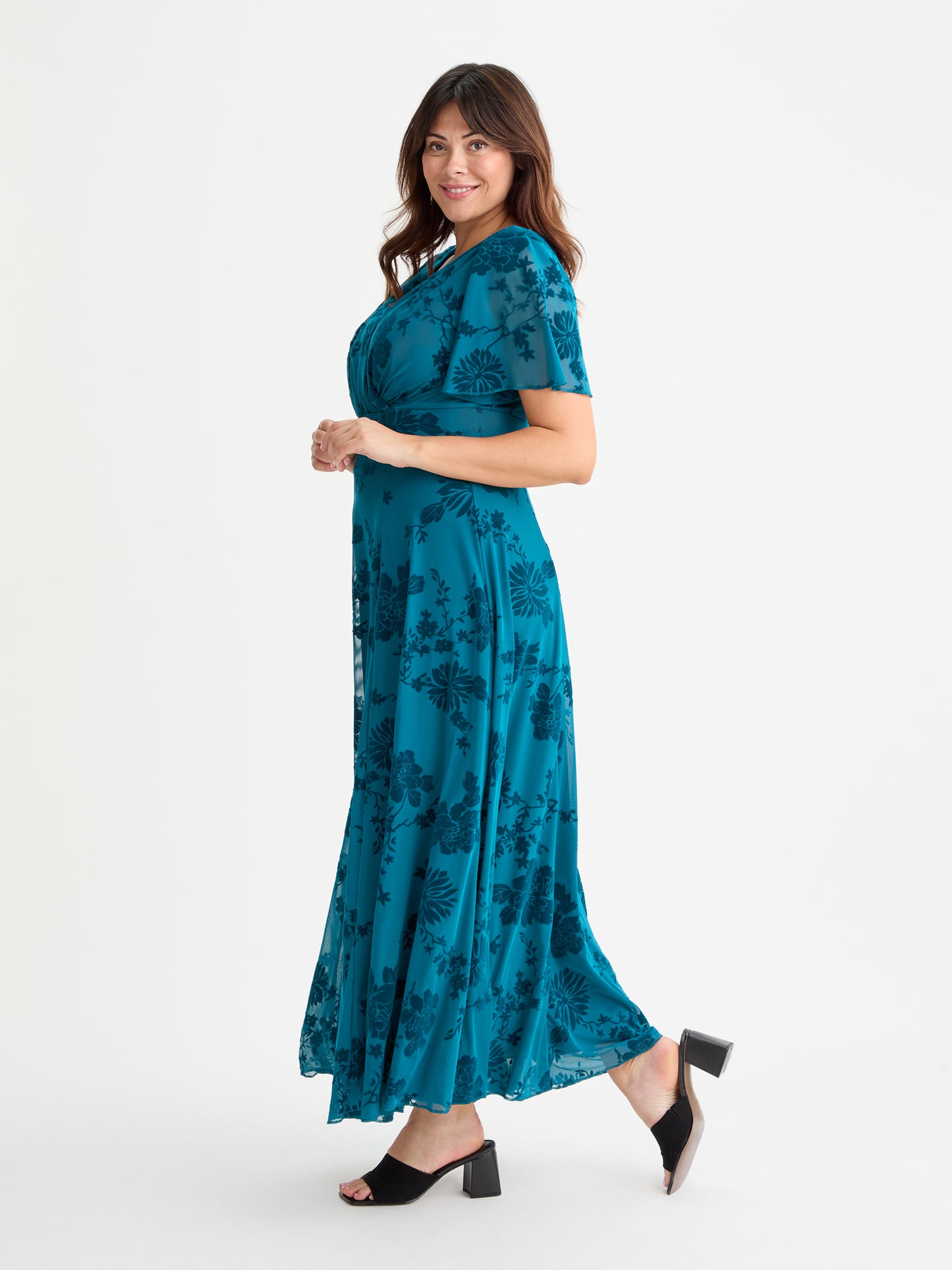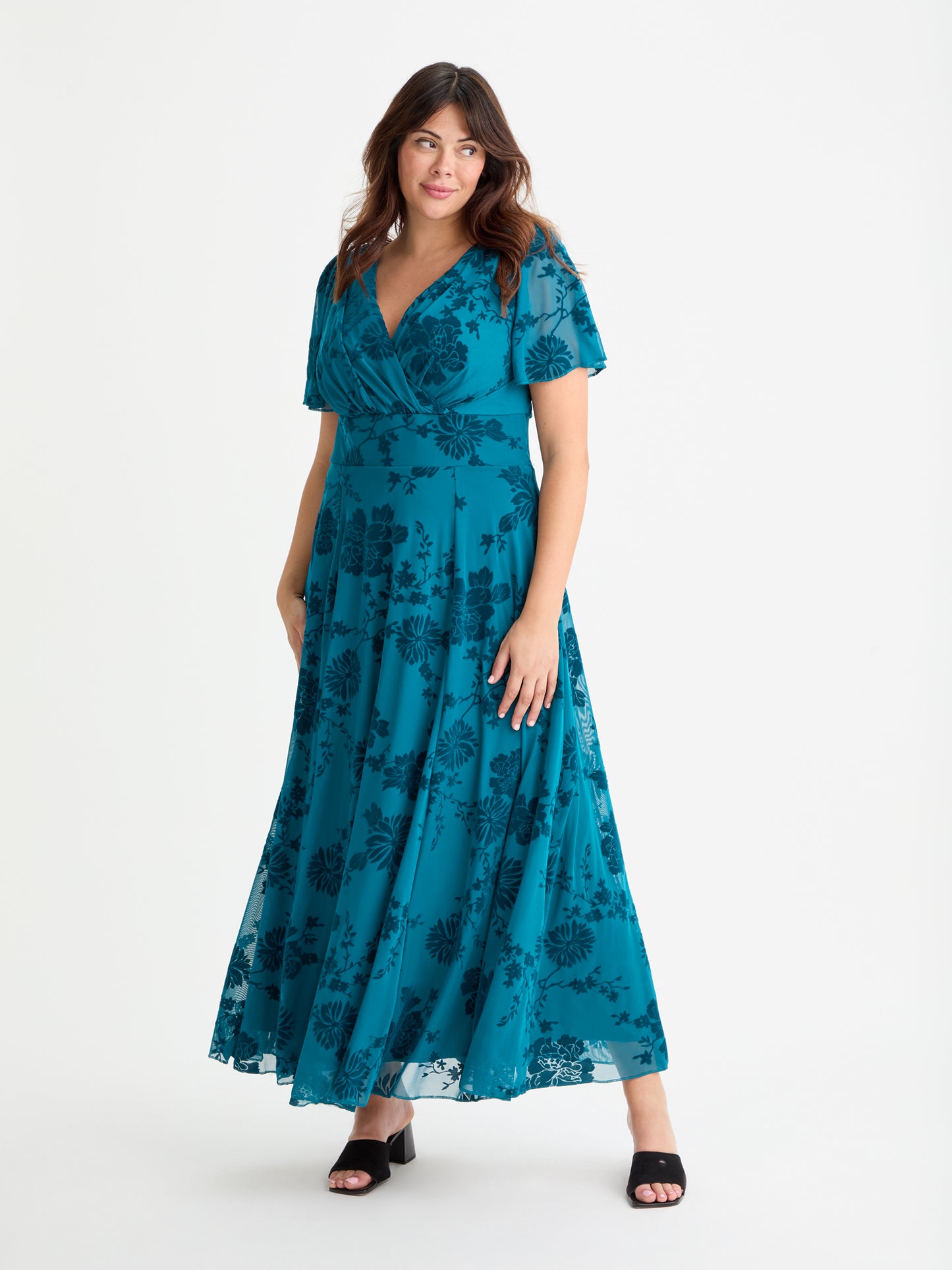 This Isabelle Float Sleeve Maxi Dress features a gorgeous velvet floral inspired by vintage Oriental floral art that the photos just can not capture. Featuring floaty angel sleeves, and a wrap V neckline. The elasticated MagicBand® enhances your figure. Perfect for any occasion, this is a truly sensational maxi dress. Made in luxury stretch POWERFIT® velvet flocked mesh. Please note there are detachable shoulder pads that elongates as per your preference.