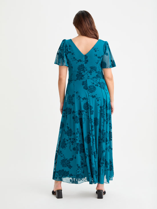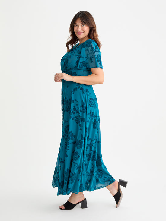 Isabelle Teal Chinoise Velvet Flock Angel Sleeve Maxi Dress