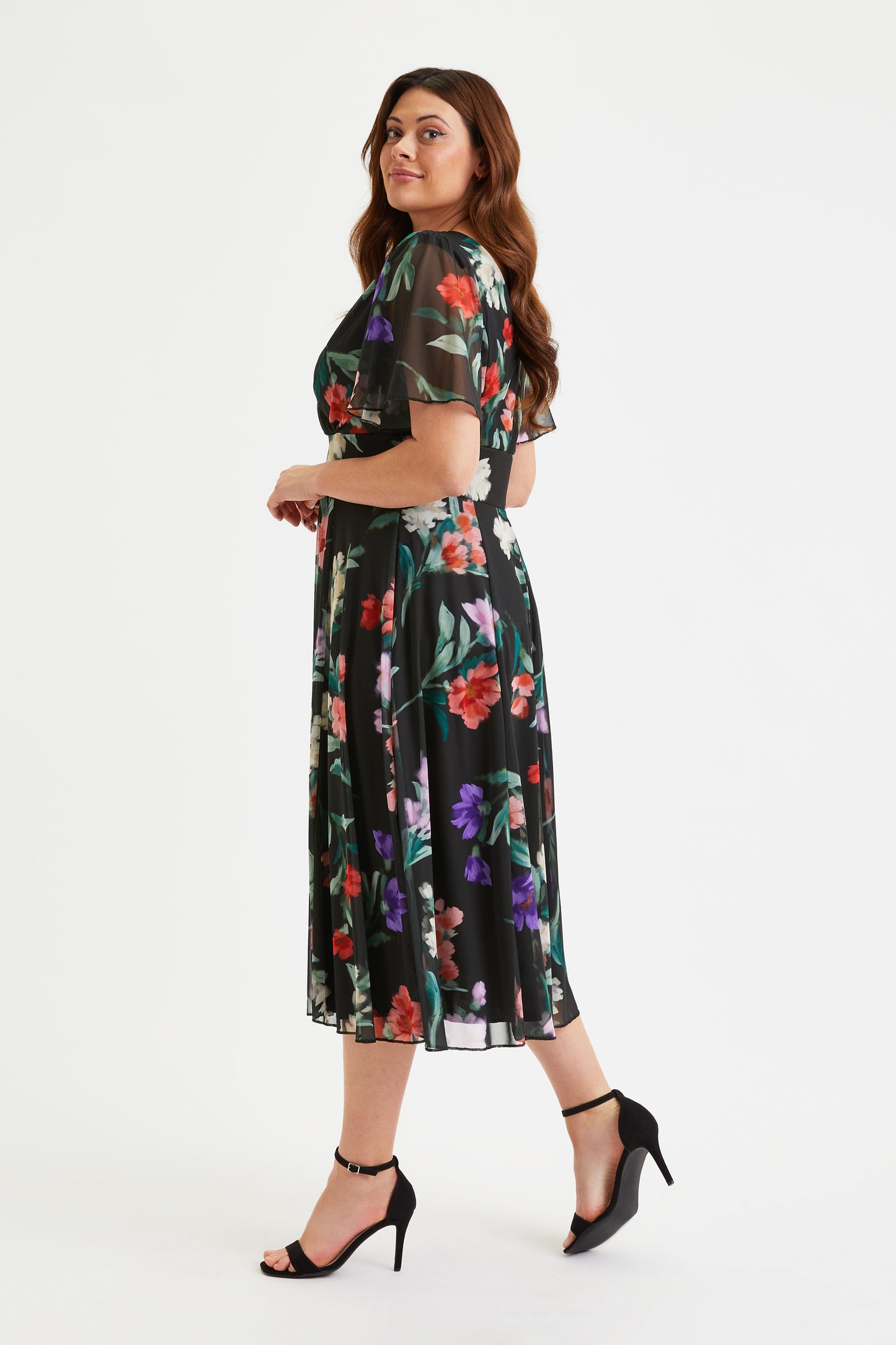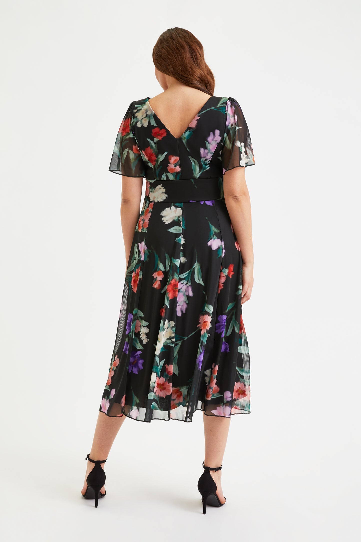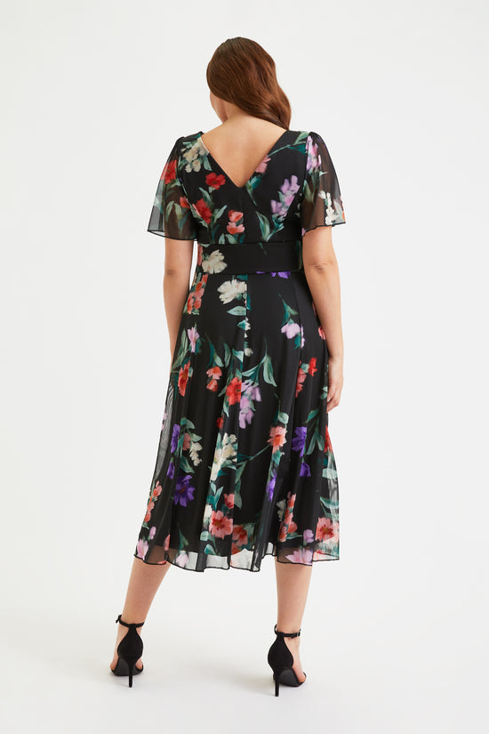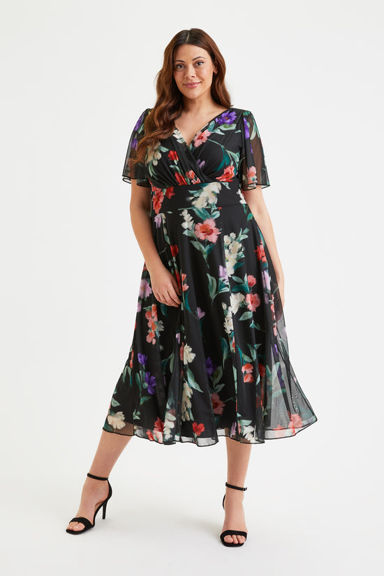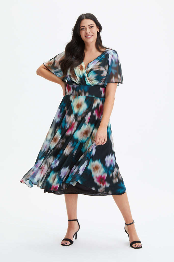 The Victoria Black Red Blue Angel Sleeve Mesh Midi Dress, is designed in a beautiful printed POWERFIT® fabric that breathes. The dress comes with a MagicBand®, built in corset to help accentuate curves and bring out that unique Scarlett & Jo hourglass shape. The deep V-neck creates a flattering feminine silhouette. This timeless fashion piece is fully lined and comes with angel sleeves to cover the upper arms. There are detachable shoulder pads per your preference.