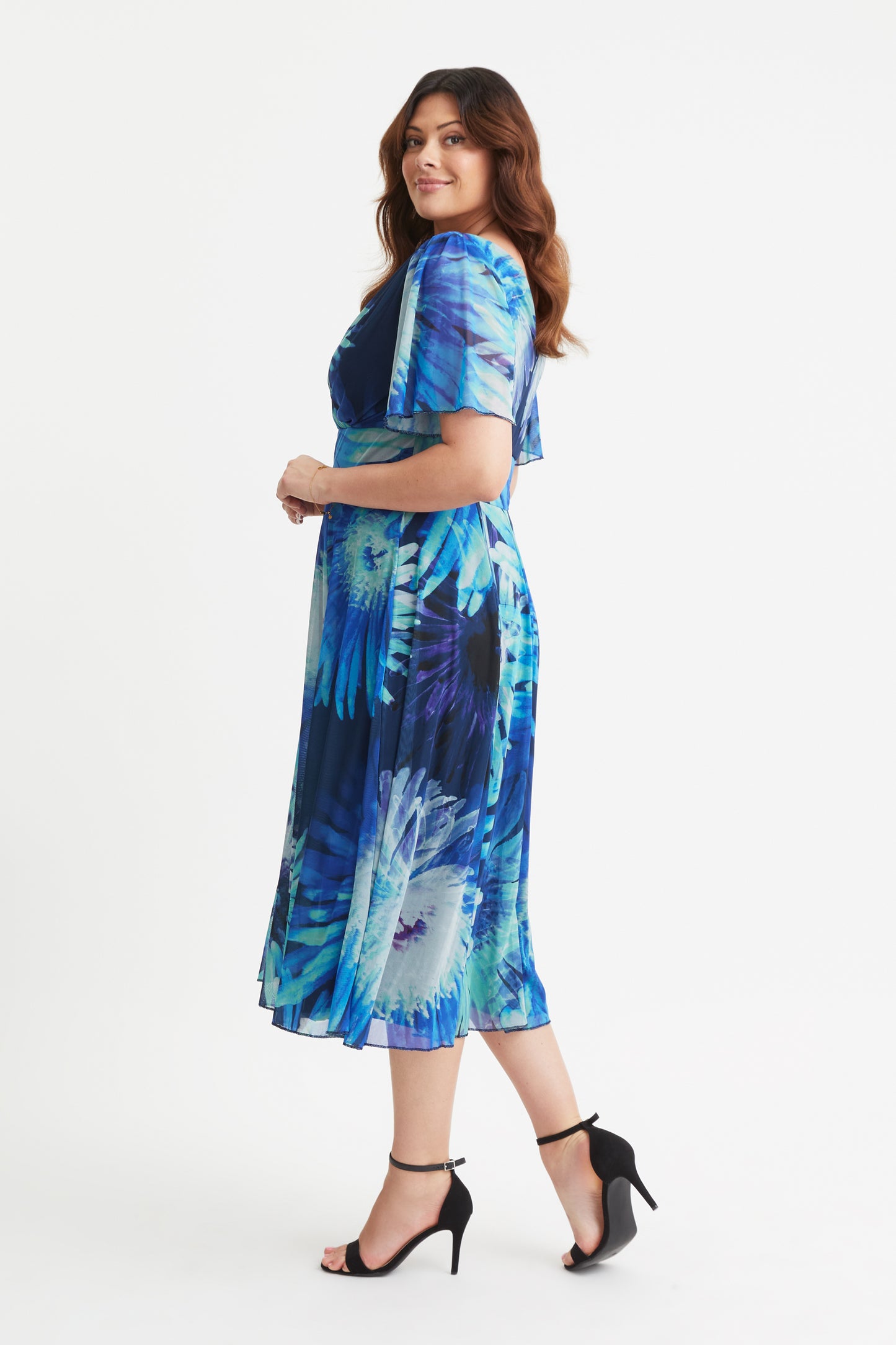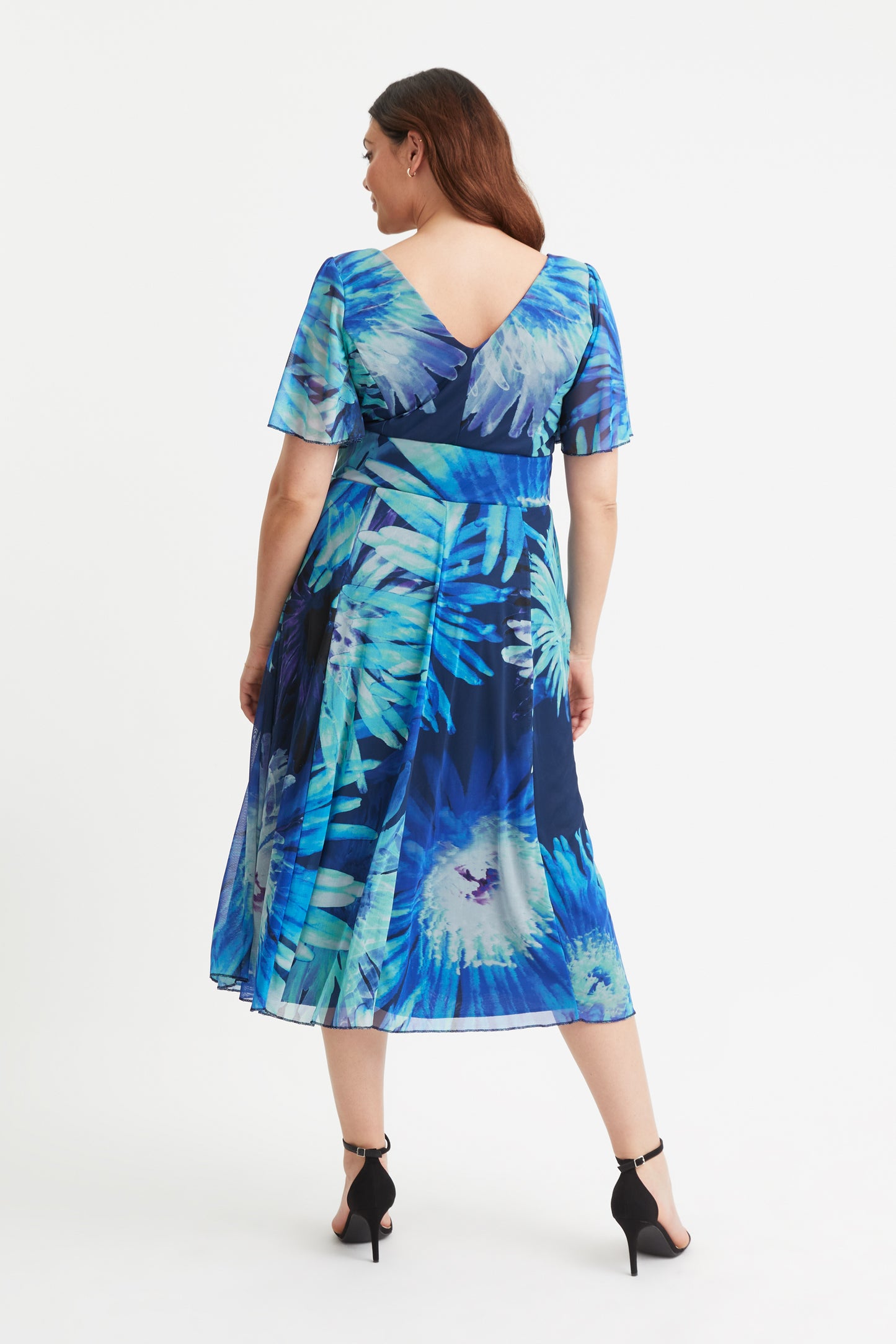 Victoria Blue Sunflower Angel Sleeve Mesh Midi Dress