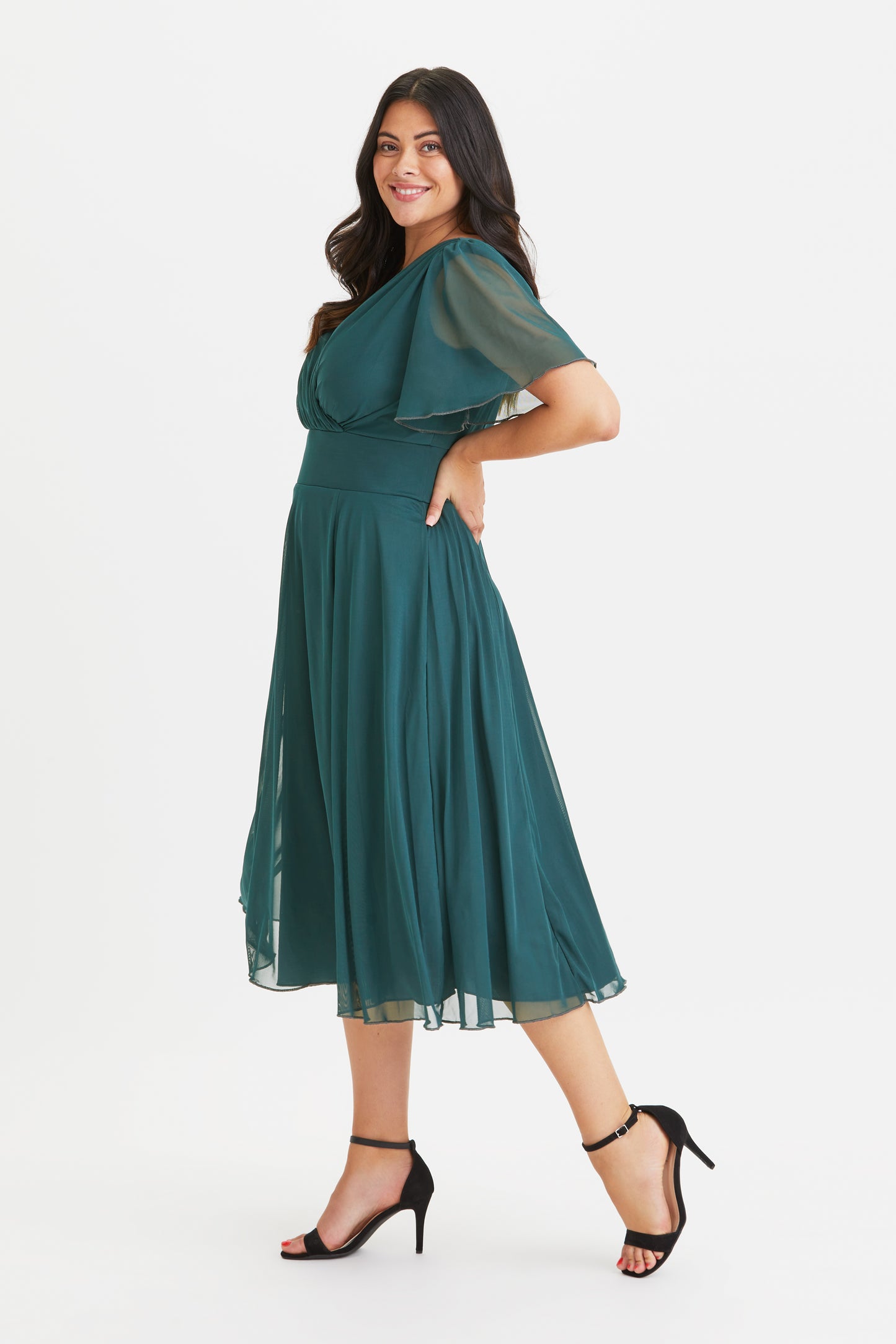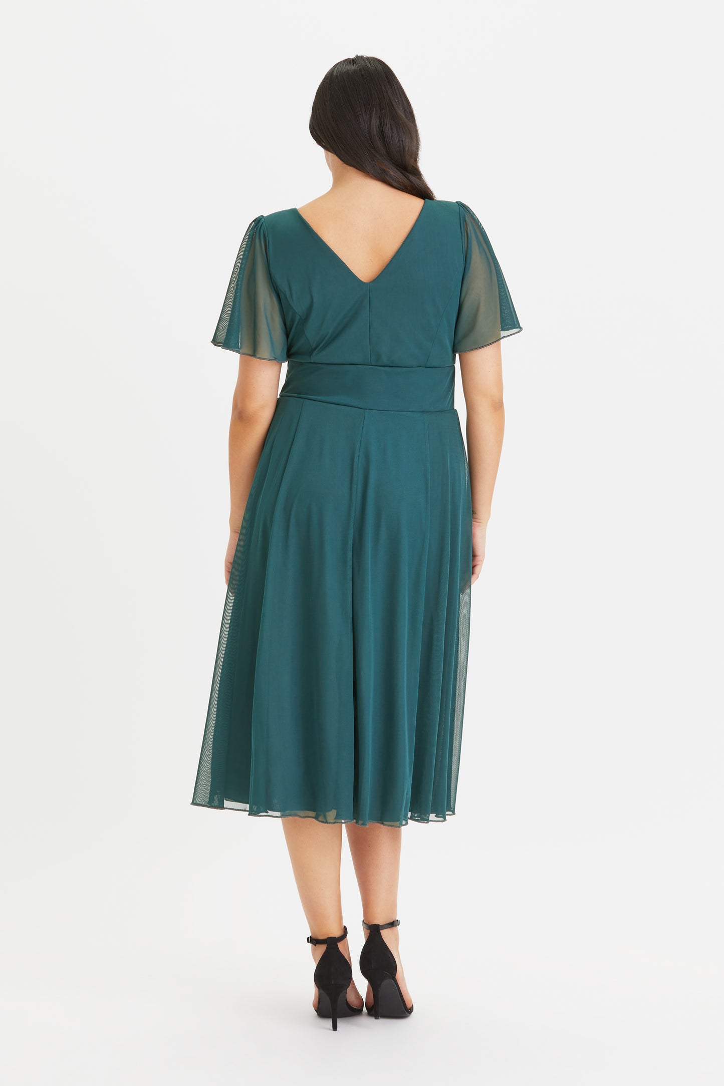 Victoria Solid Bottle Green Angel Sleeve Mesh Midi Dress