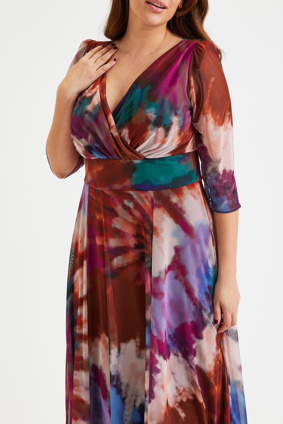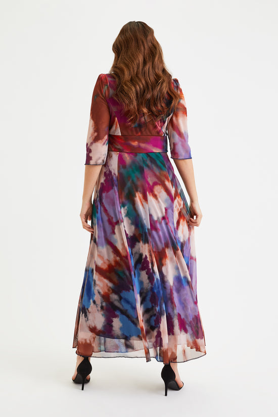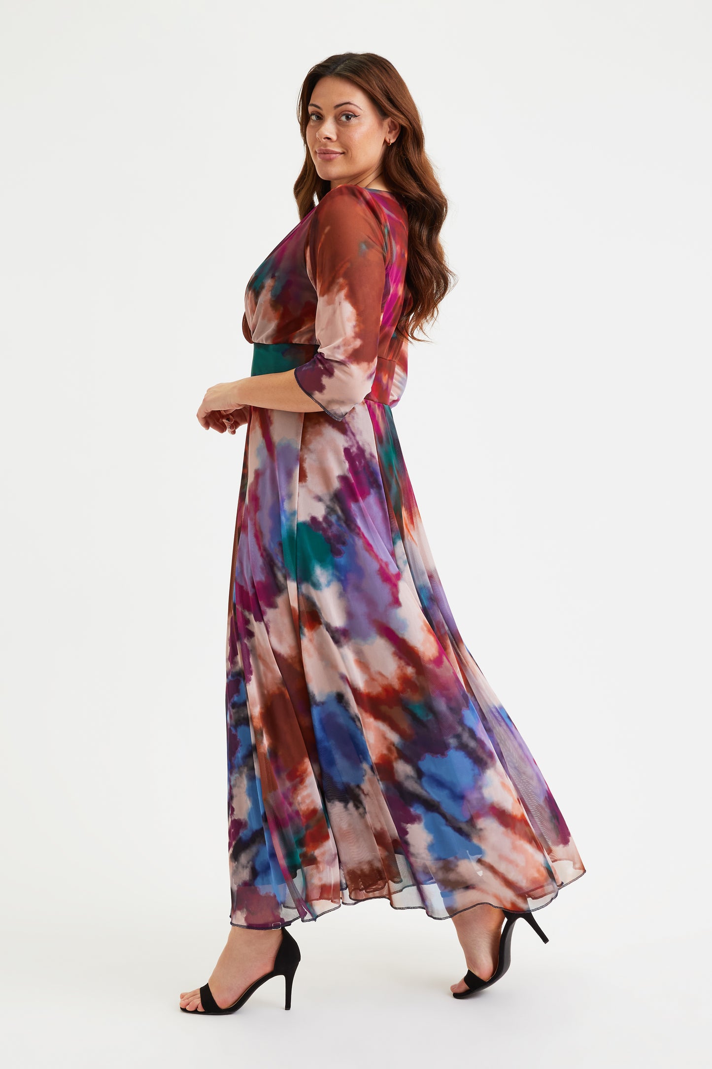 A stunning tan indigo print maxi gown. This truly beautiful print gown is made in our POWERFIT® soft and flowy stretch mesh. This gown features a flattering wrap bodice supported by Scarlett & Jo's signature MagicBand® that enhances shape whilst also featuring a fully flowing skirt that tapers to swish and swirl. The dress has 3/4 sleeves set into a pretty shoulder line with small detachable shoulder pads..