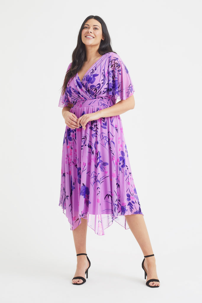 The Julie Navy Cream Hanky Hem Dress has an extraordinarily pretty navy cream print and fully lined dress. This dress is made in a super soft stretch POWERFIT® mesh, a fabric that breathes.  The beautifully shaped crossover bodice together with a full handkerchief hem skirt elegantly falls at a midi length on taller ladies and maxi length for shorter ladies. Finished with a new flattering handkerchief sleeve and elasticated MagicBand® to cinch you in with that Scarlett & Jo signature shape.