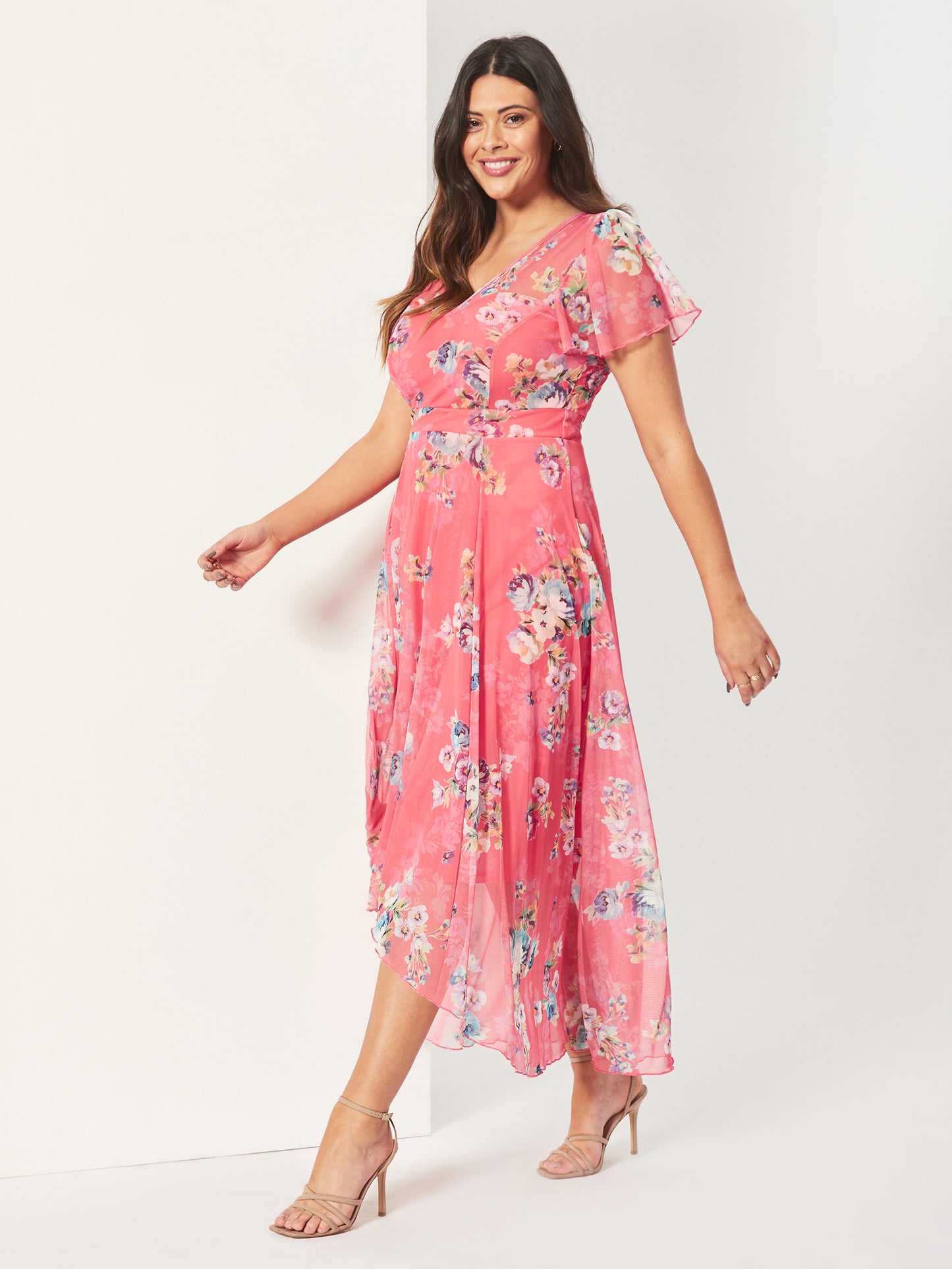 Tilly Coral Multi Print Angel Sleeve Sweetheart Dress