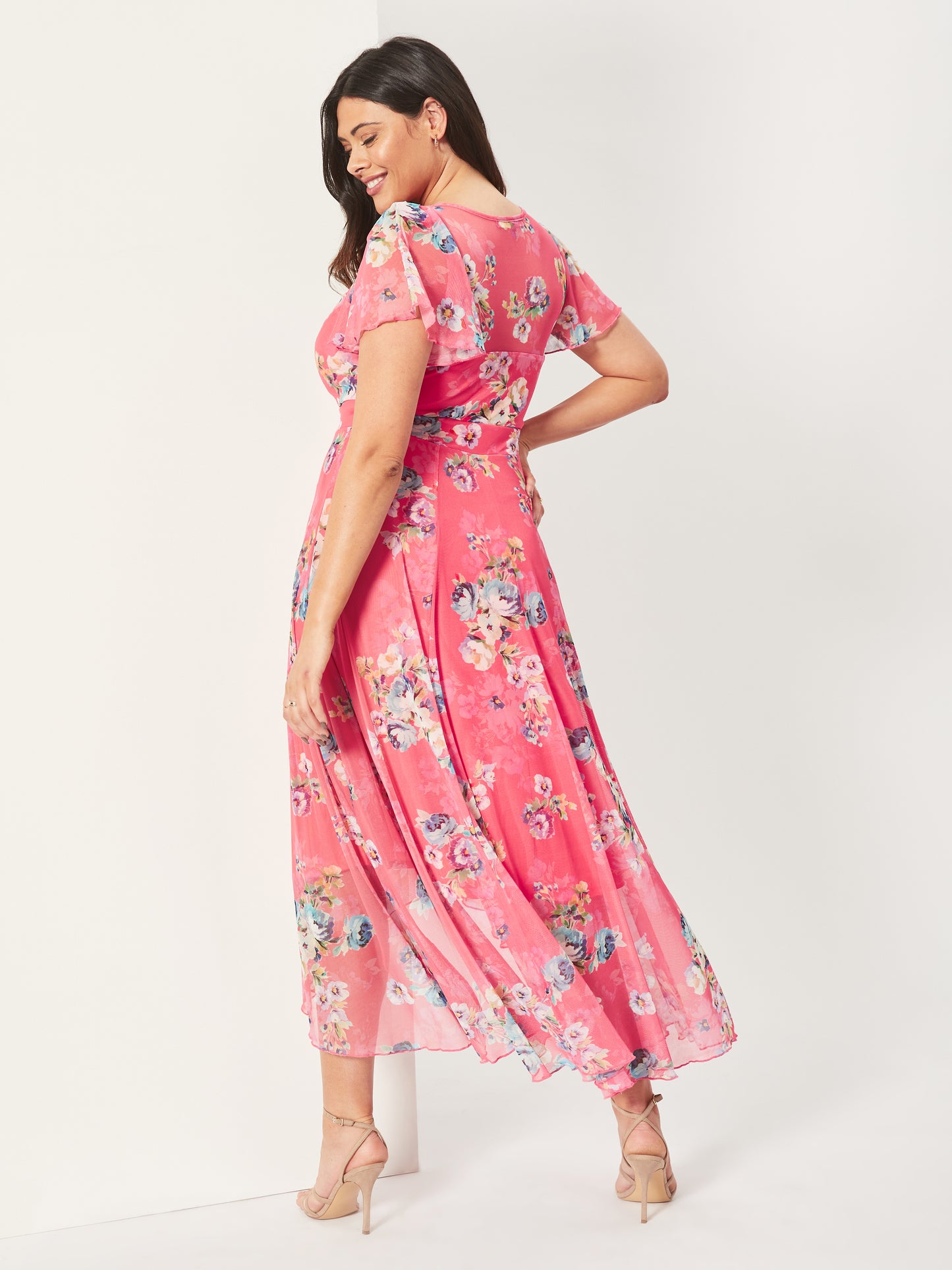 100's of women were introduced to Scarlett & Jo through the original. Treat yourself to a gorgeous updated print Tilly Hi-Lo Dress. With a V front and shaped lined  sweetheart detail. This is a stunning fully lined dress that does not disappoint with its signature print. The dress that is designed to breathe, features a gathered 1940s shoulder line and pretty angel sleeves to give upper arm coverage. Designed with our inbuilt mini-corset magic waistband to give you that unmistakable Scarlett and Jo silhouette so curves are elegantly accentuated and hidden support is provided. The beautiful dress skirt drapes gracefully to the ground with a Hi-Lo effect. Perfect for any social event from wedding guest dress to prom dress to party dress.