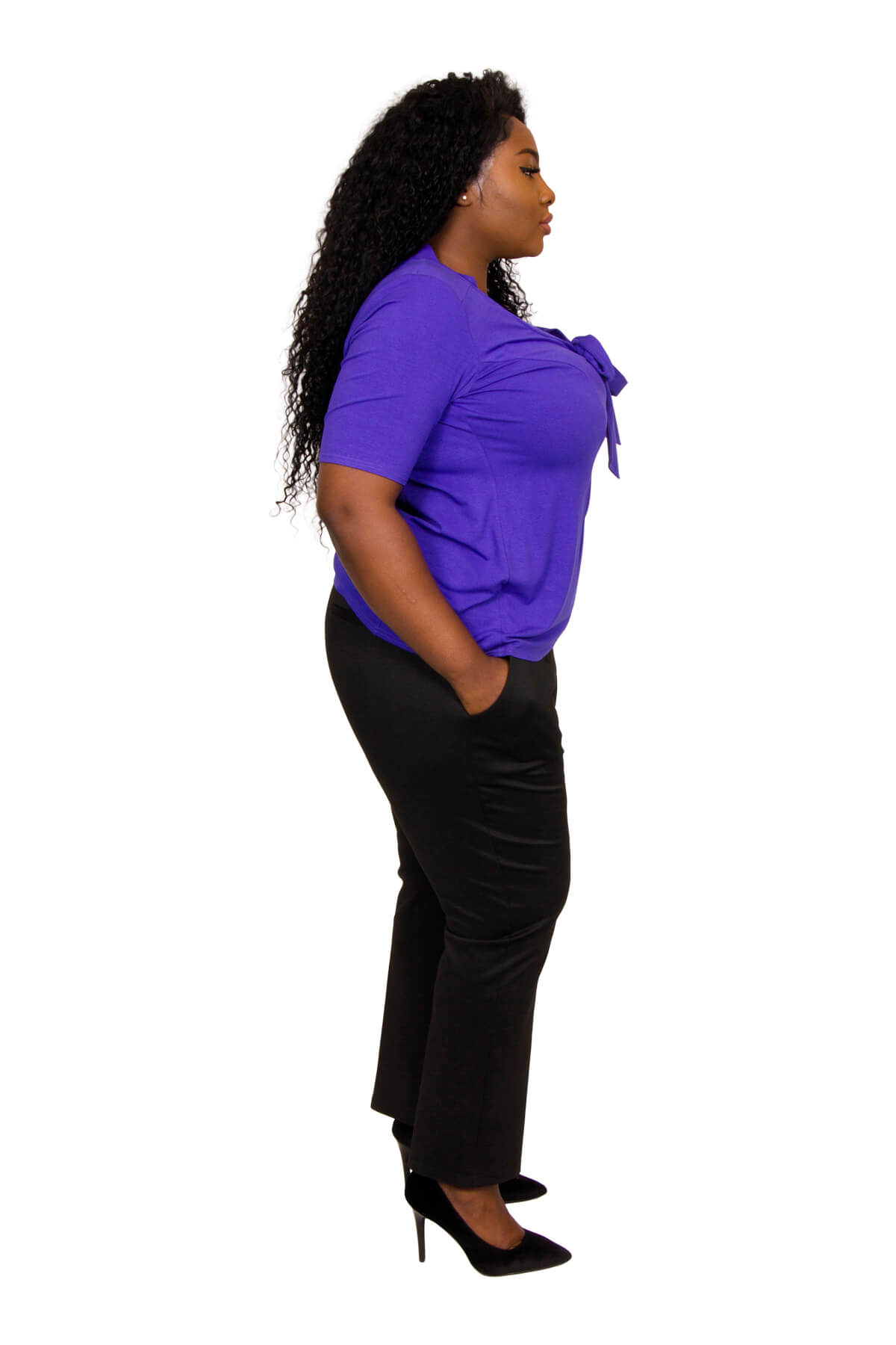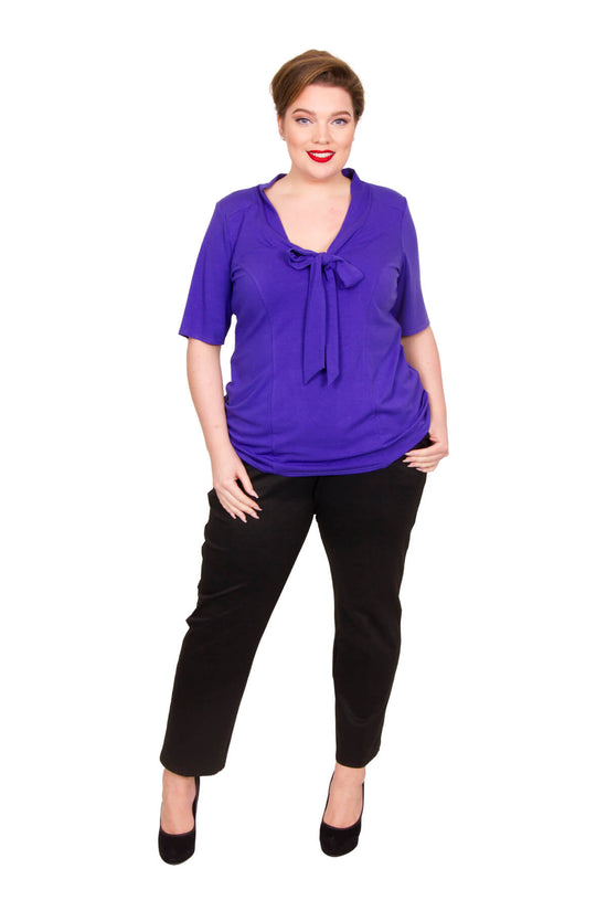 Our Vintage Pussy Bow Knot Front Jersey Top is an excellent smart wear piece to team with any skirt/trouser of your choice. The soft jersey fabric is for added comfort. Short sleeves make for an elegant styling choice. The knot front detail presents a feminine attire; the perfect garment for both work and day wear.