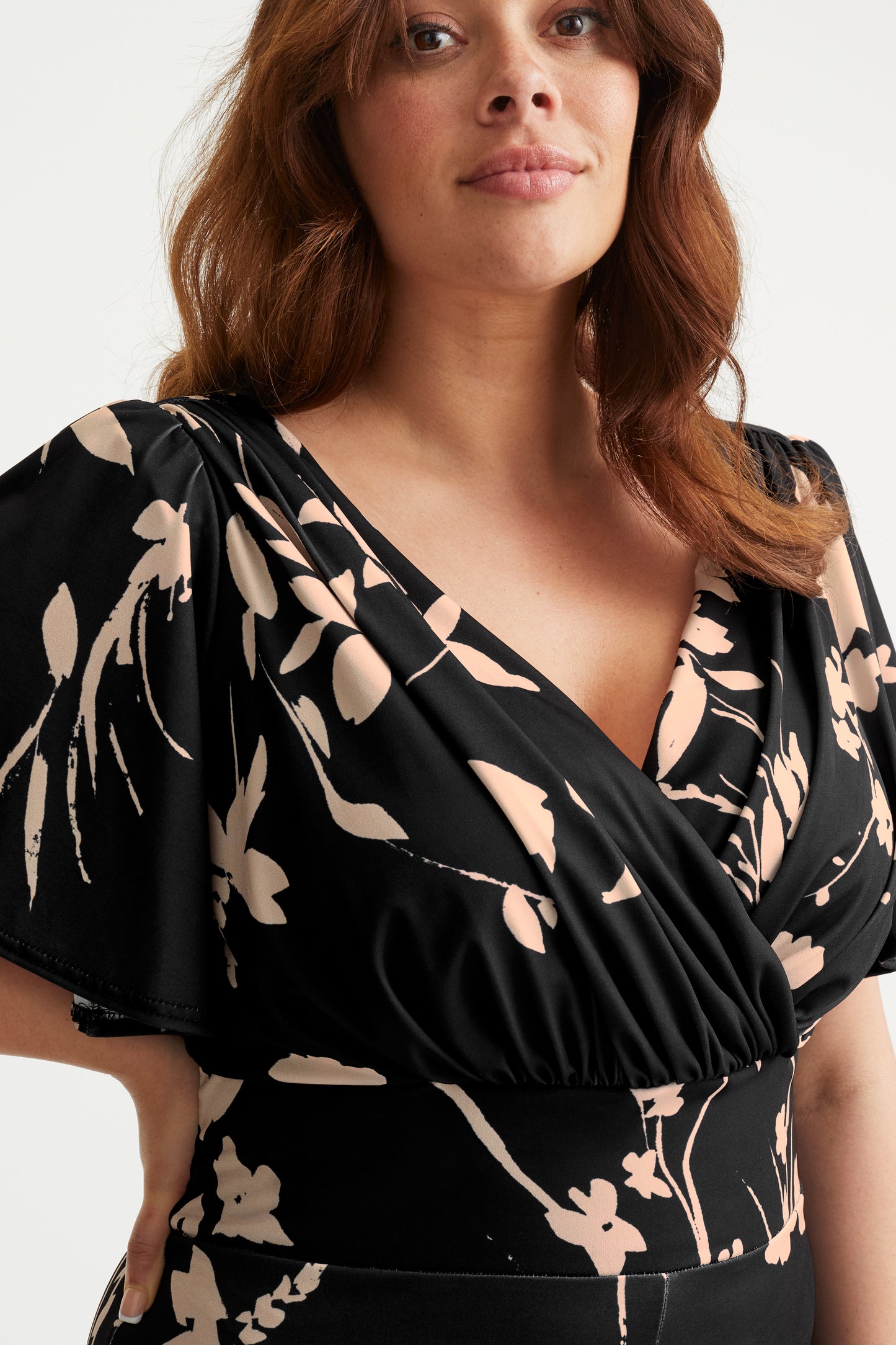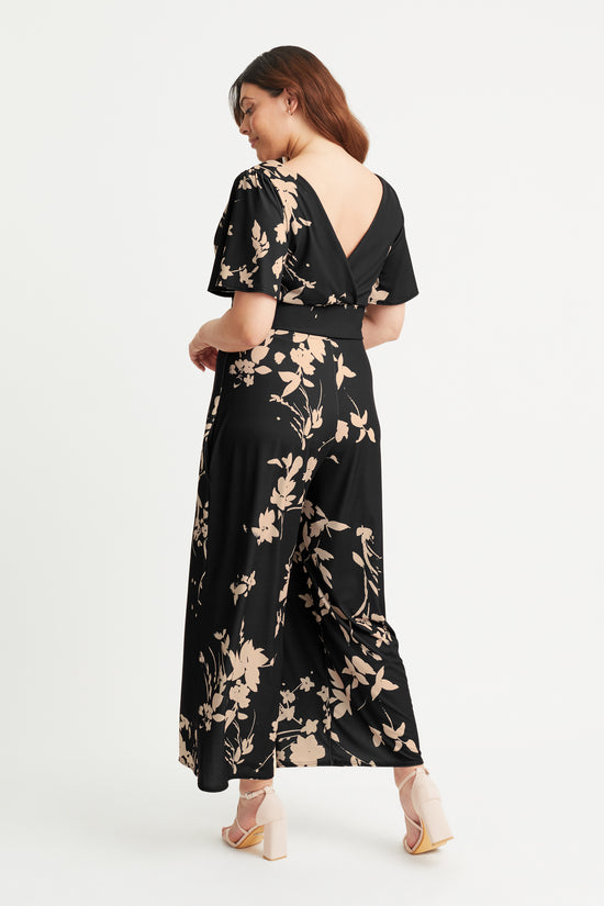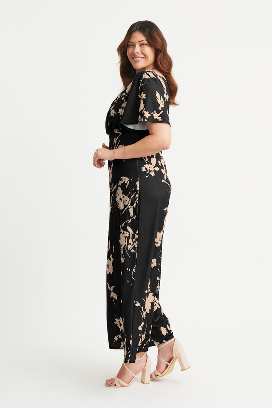 Our 5 star rating lounge jumpsuit is made in our exclusive "Silk Touch Crepe By Scarlett & Jo"™.  It is a very fine, soft and substantial jersey. This print version is in an exclusive print,  comes with the MagicBand® to help accentuate curves and create hidden support. Designed to flatter all body shapes, our jumpsuit has pockets, angel sleeves, a v shaped neckline front and back, soft shoulder pads and wide trouser legs. Dress it up or down for a fabulous look!