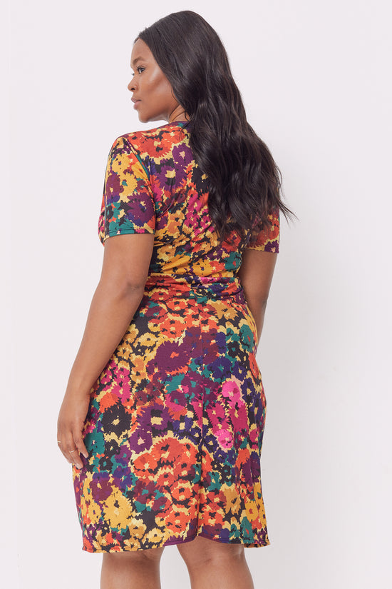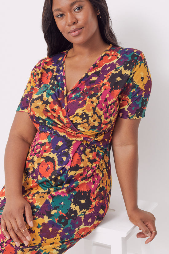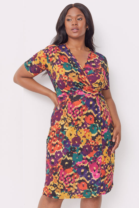 A 1940's inspired dress featuring gorgeous angel sleeves. The dress is made in a beautiful super soft print flowing jersey. Its  perfect if you are looking for day or night, any time of year! Crafted from a soft jersey and featuring the Scarlett & Jo signature wrap neckline, this beautifully shaped dress is destined to flatter any figure. With a twist side detail to accentuate your figure this dress falls elegantly to a demure over the knee midi length and is perfect for any time of year.
