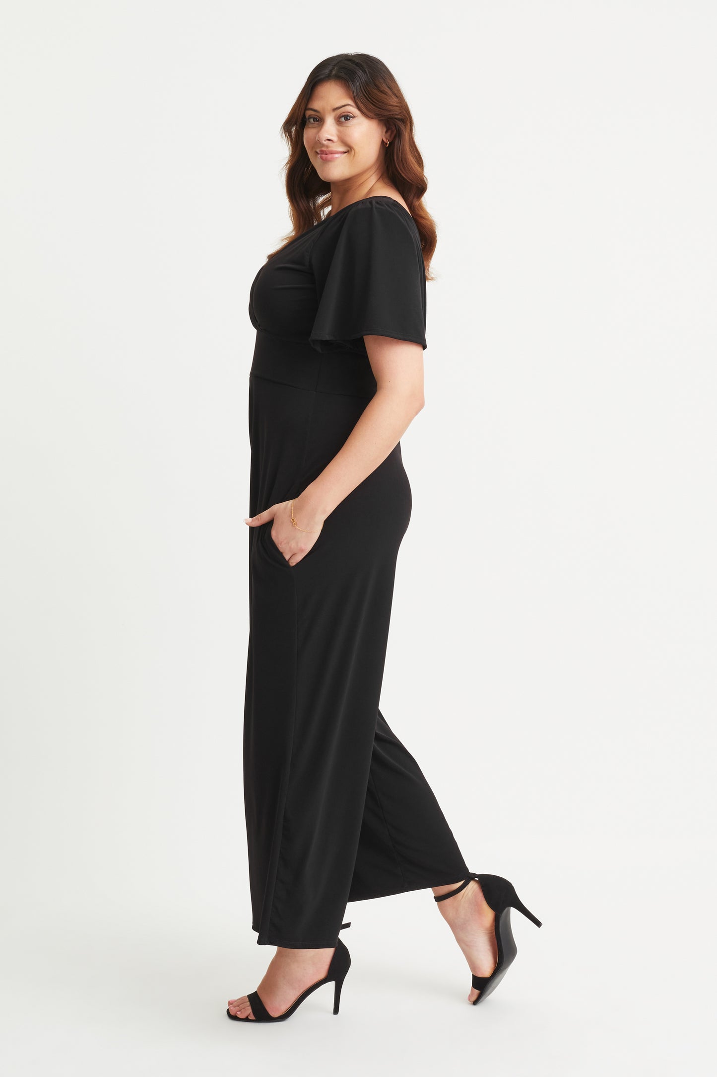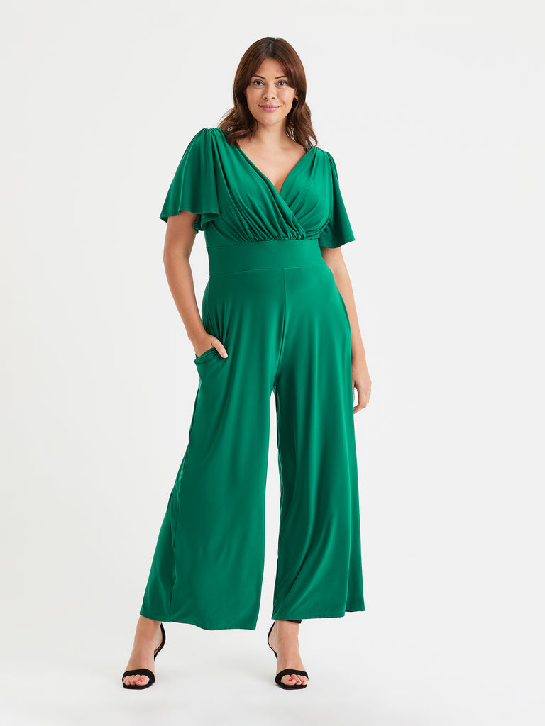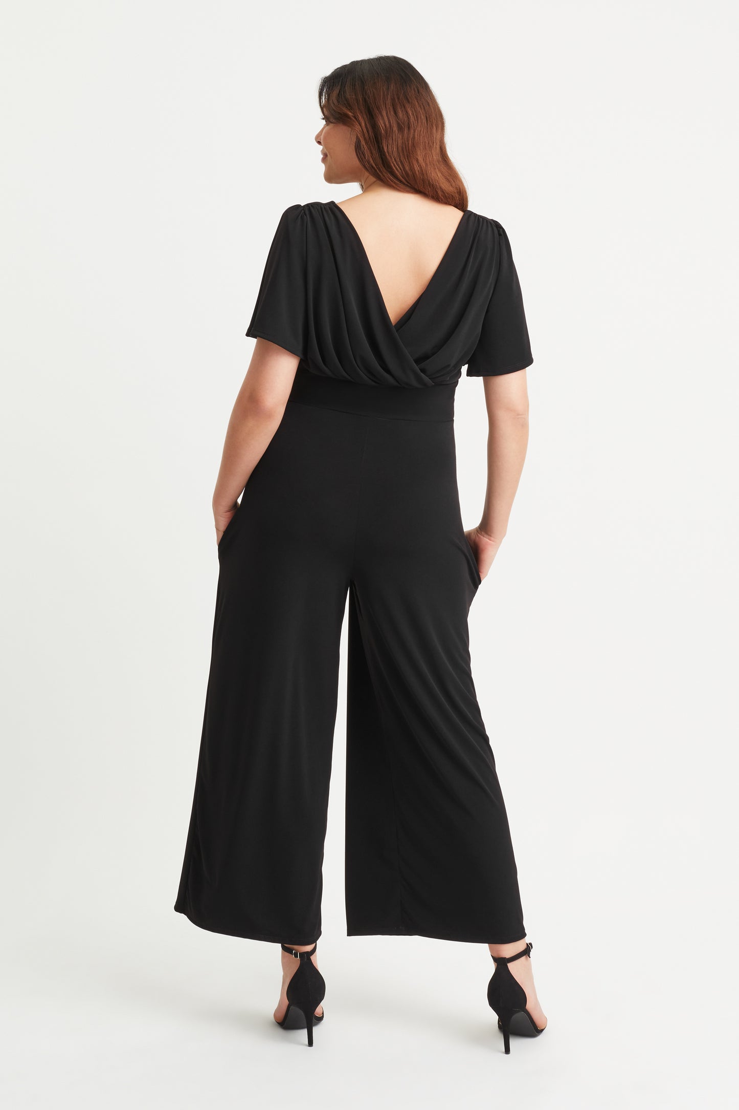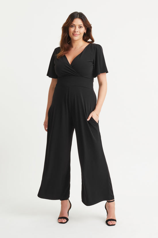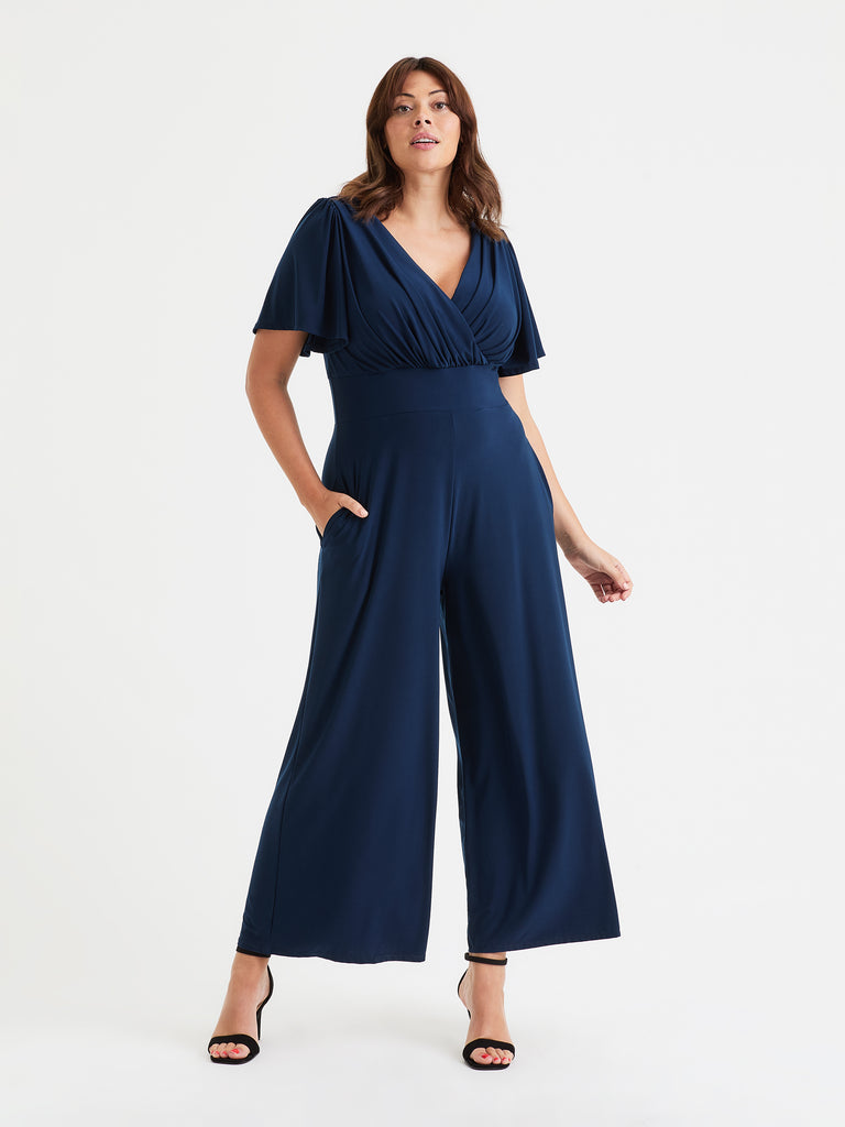 Our 5 star rating lounge jumpsuit is made in our exclusive "Silk Touch Crepe By Scarlett & Jo"™  It is a very fine, soft and substantial jersey. It comes with the MagicBand® to help accentuate curves and create hidden support. Designed to flatter all body shapes, our jumpsuit has pockets, angel sleeves, a v shaped neckline front and back, soft shoulder pads and wide trouser legs. Dress it up or down for a fabulous look!