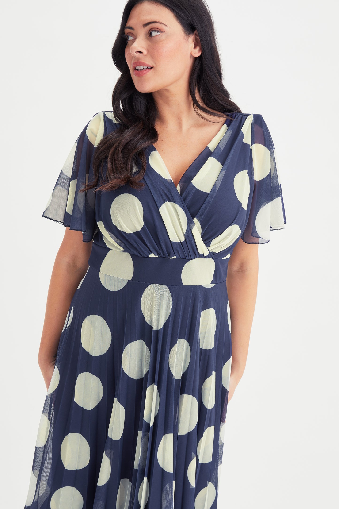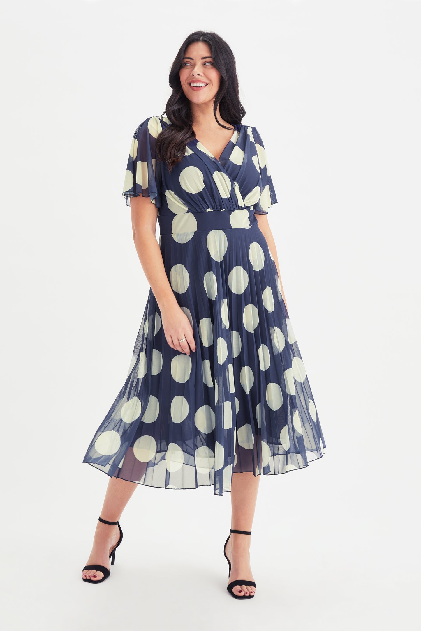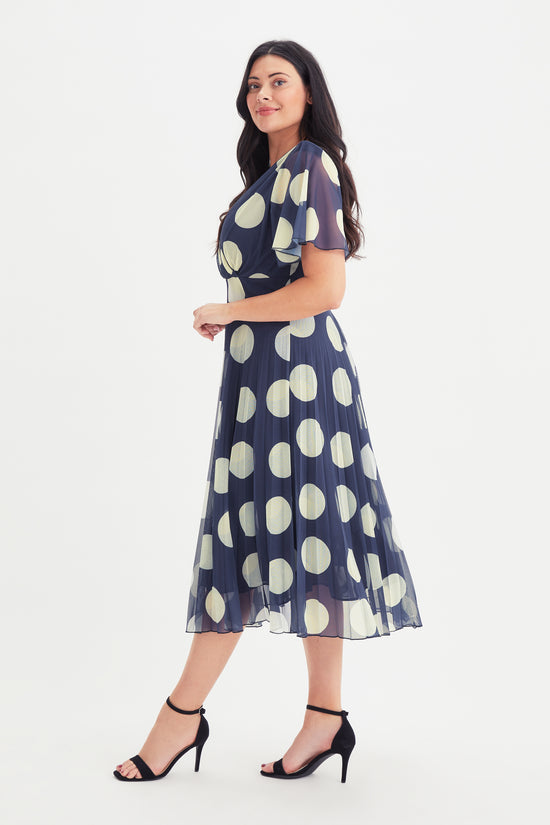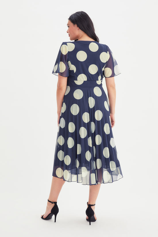 Carole Navy White Wrap Bodice Sunray Pleated Skirt Midi Dress
