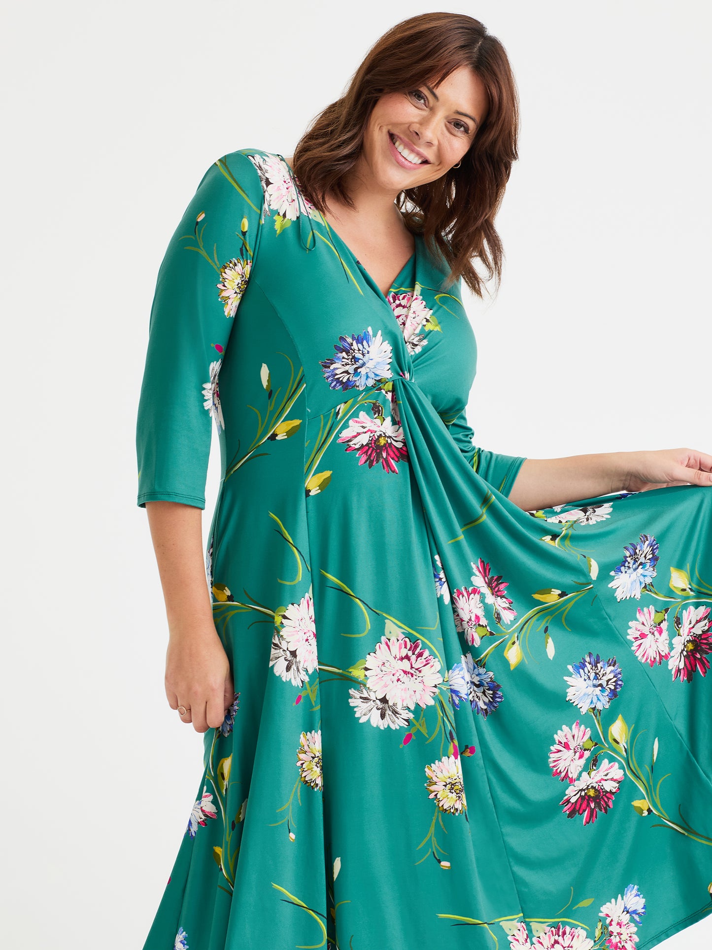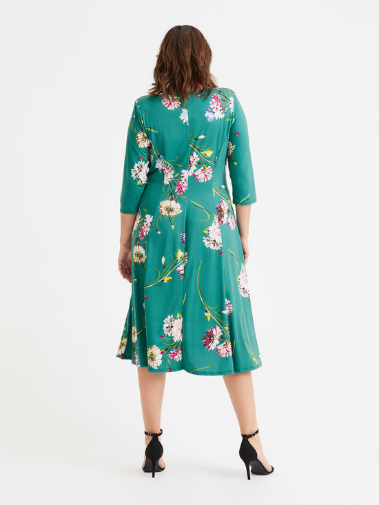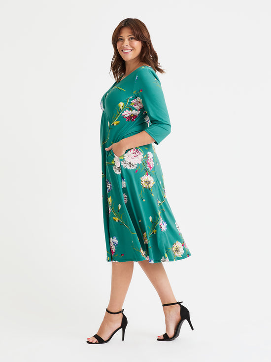 Elevate your seasonal wardrobe in this form-flattering fit and flare dress. Designed in a super soft 'peach touch' print stretch fabric. This piece boasts a beautiful knot front detail and a swishy skirt for added movement. Falls to a mid-length with ¾ sleeves, v neck and princess seams for shape. There are detachable shoulder pads per your preference.