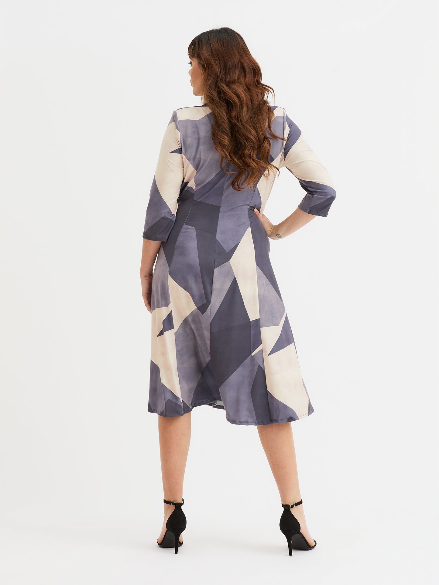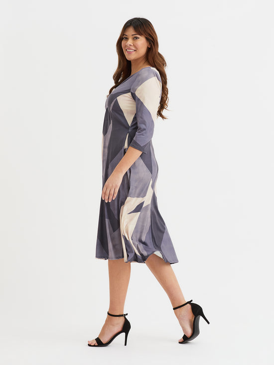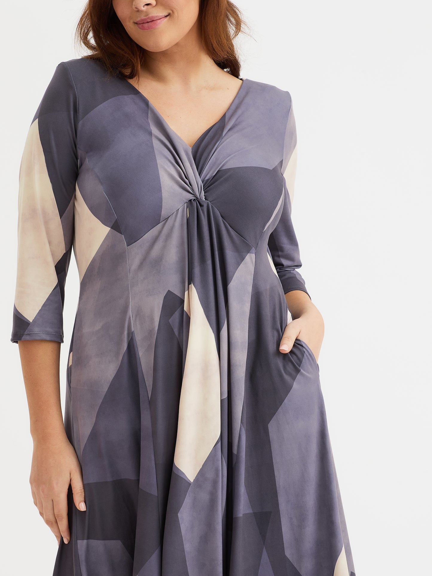 Elevate your seasonal wardrobe in this form-flattering fit and flare dress. Designed in a super soft 'peach touch' polyester elastane stretch fabric. This piece boasts a beautiful knot front detail and a swishy skirt for added movement. Falls to a mid-length with ¾ sleeves, v neck and princess seams for shape.