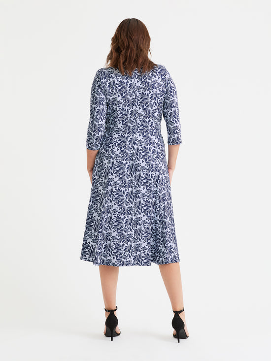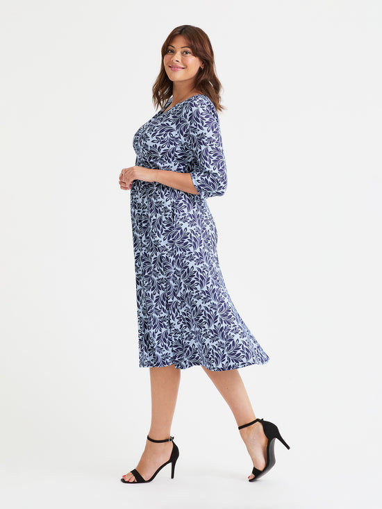 Elevate your seasonal wardrobe in this form-flattering fit and flare dress. Designed in a super soft 'peach touch' print stretch fabric. This piece boasts a beautiful knot front detail and a swishy skirt for added movement. Falls to a mid-length with ¾ sleeves, v neck and princess seams for shape. There are detachable shoulder pads per your preference.