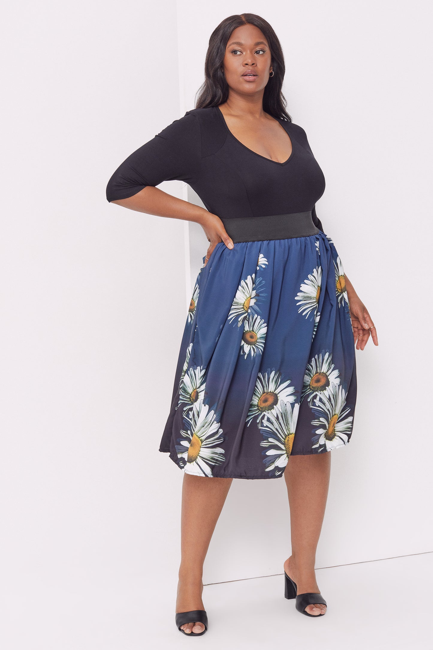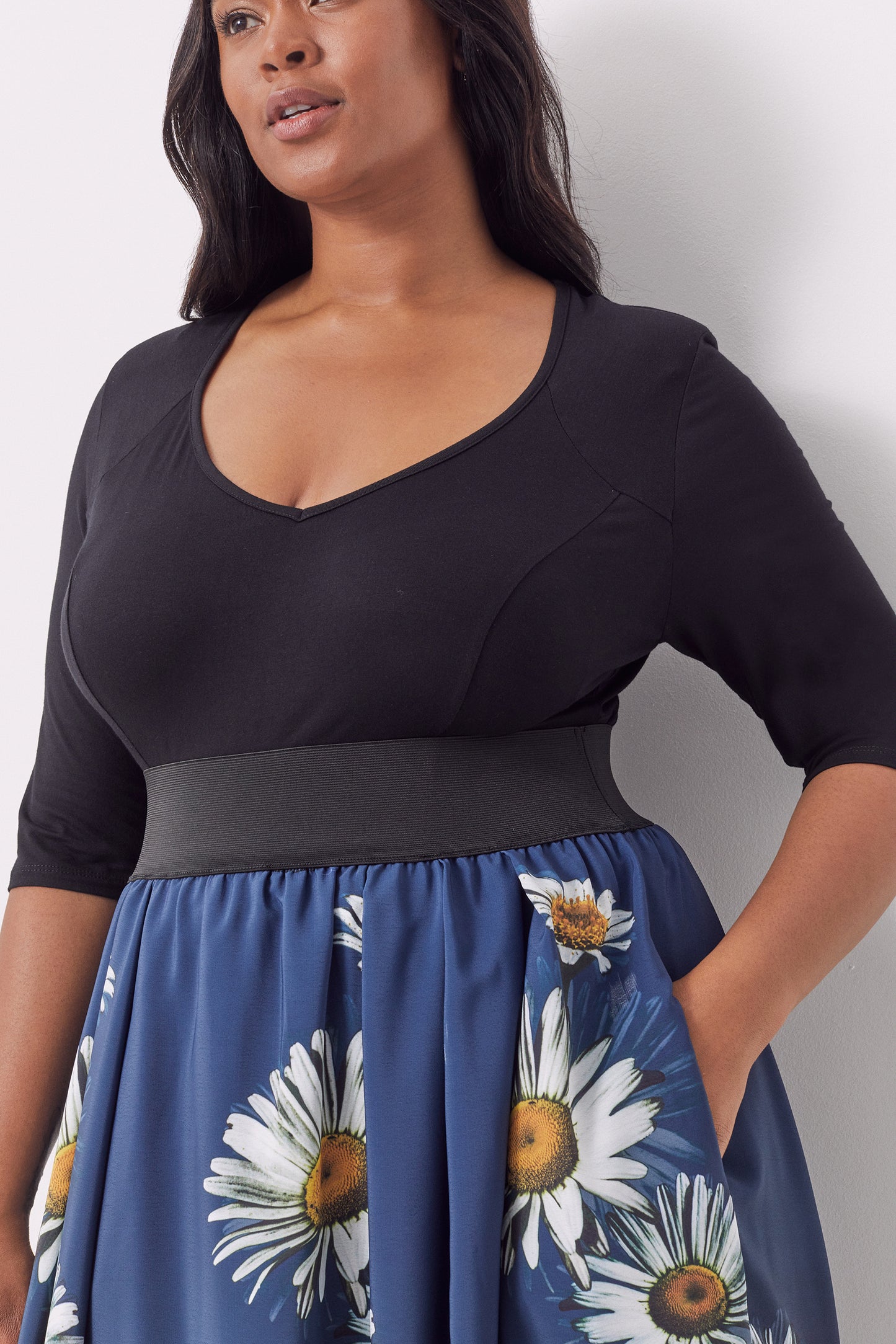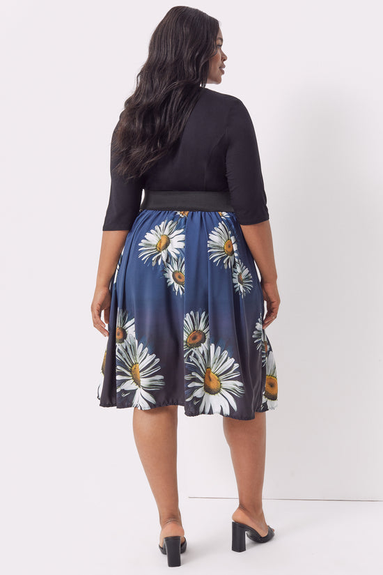 The Daisy 2 in 1 Dress features the beautiful and celebrated Scarlett & Jo "ombre" daisy floral print skirt. The skirt is black at the hem and midnight blue progressively through to waistband. The skirt is fully lined and has pockets. The 3/4 sleeves and bolero detail sweetheart neck top adds class to a timeless iconic fashion piece. The 2 in 1 is completed by a magic waistband to support your waist and accentuates your curves. This dress will give you a flattering hourglass shape, creating the ultimate piece for every and any occasion.