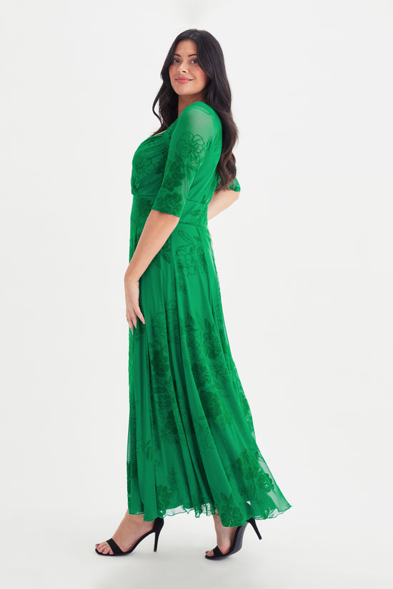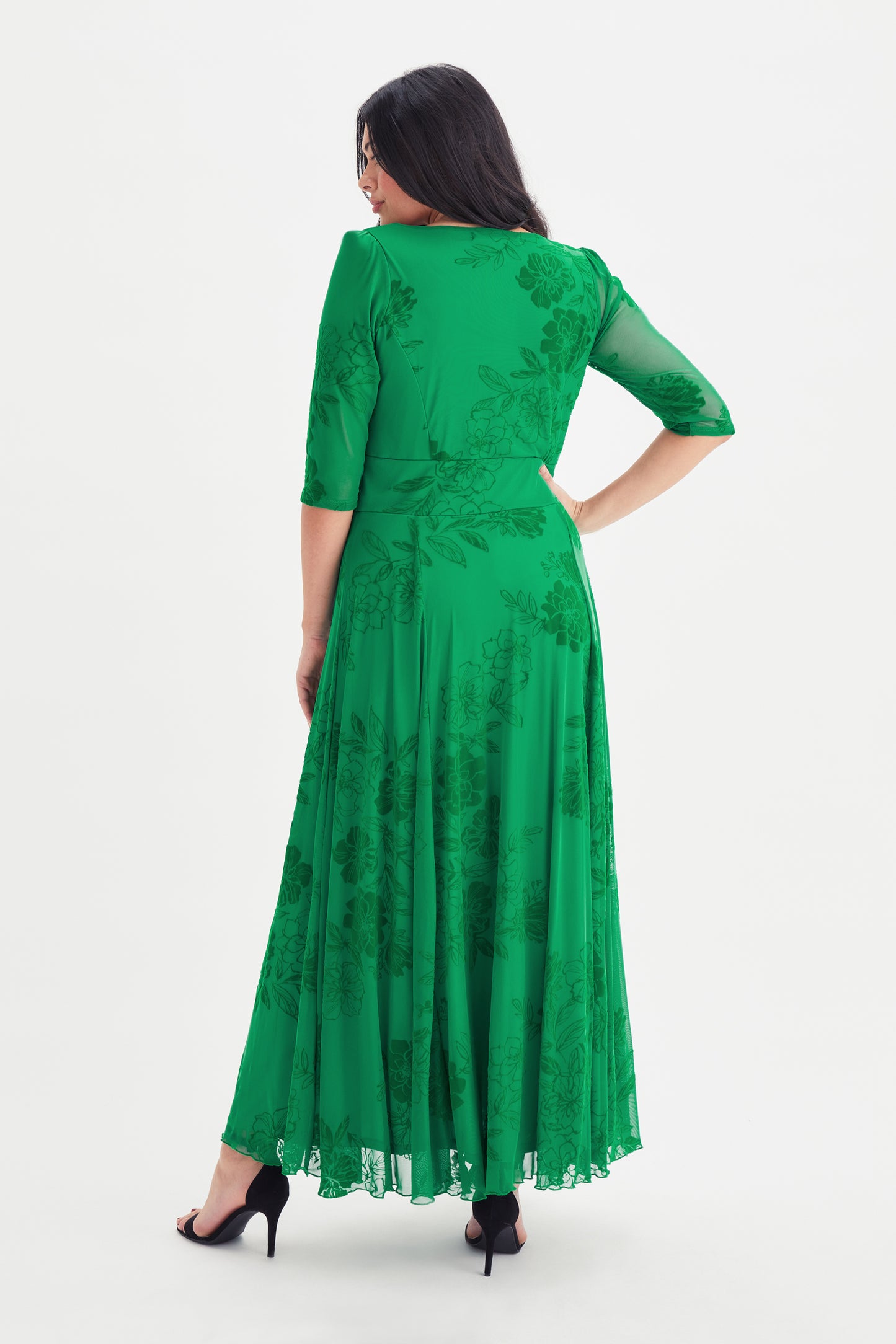 Elizabeth Green Velvet Flocked Mesh Maxi Gown