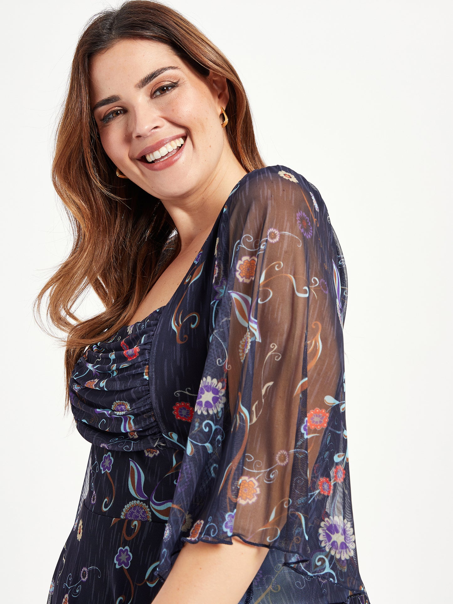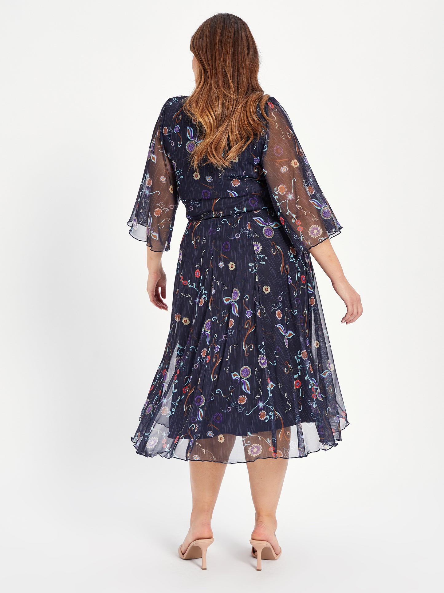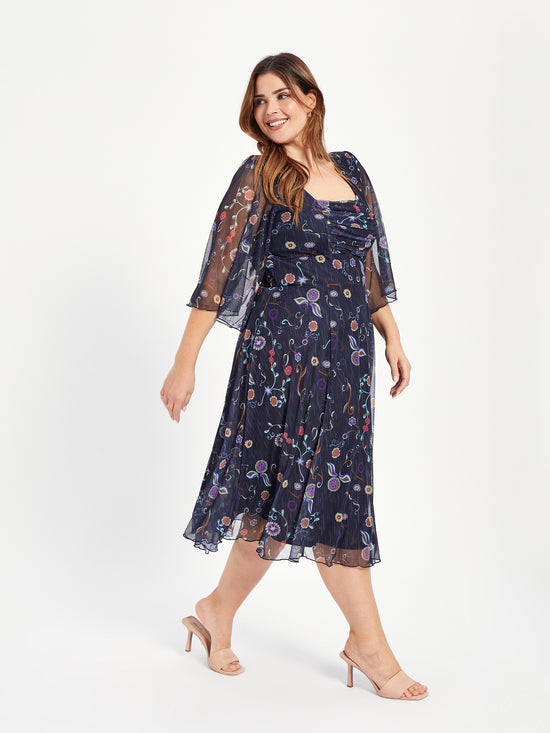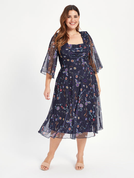 Genevieve Navy Multi Ruched Bodice Midi Dress
