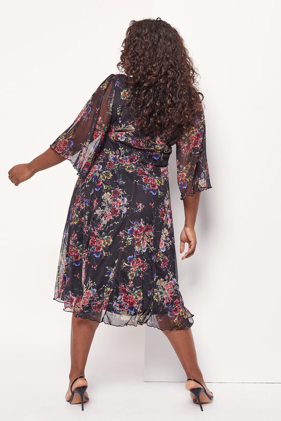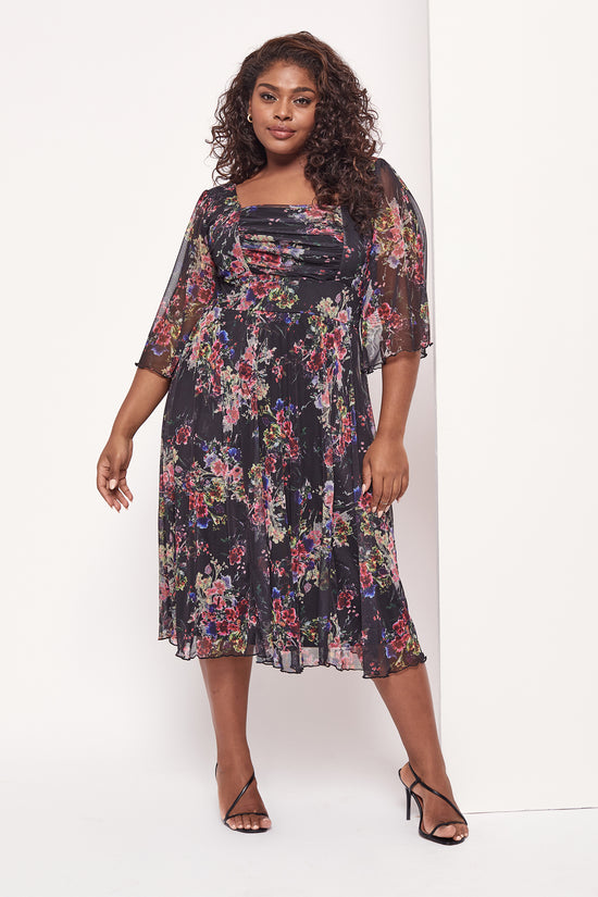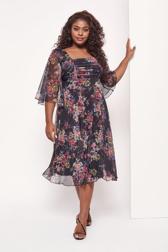 The Genevieve Ruched Bodice Midi Dress, is inspired by a romantic medieval silhouette complete with 3/4  gently fluted sleeves. This beautiful printed dress is fully lined featuring a flattering square neck line and gathered bodice through to a magic inbuilt magic band waist that cinches you in and supports you into the unmistakable softly tailored Scarlett & Jo curve silhouette includes detachable shoulder pads.