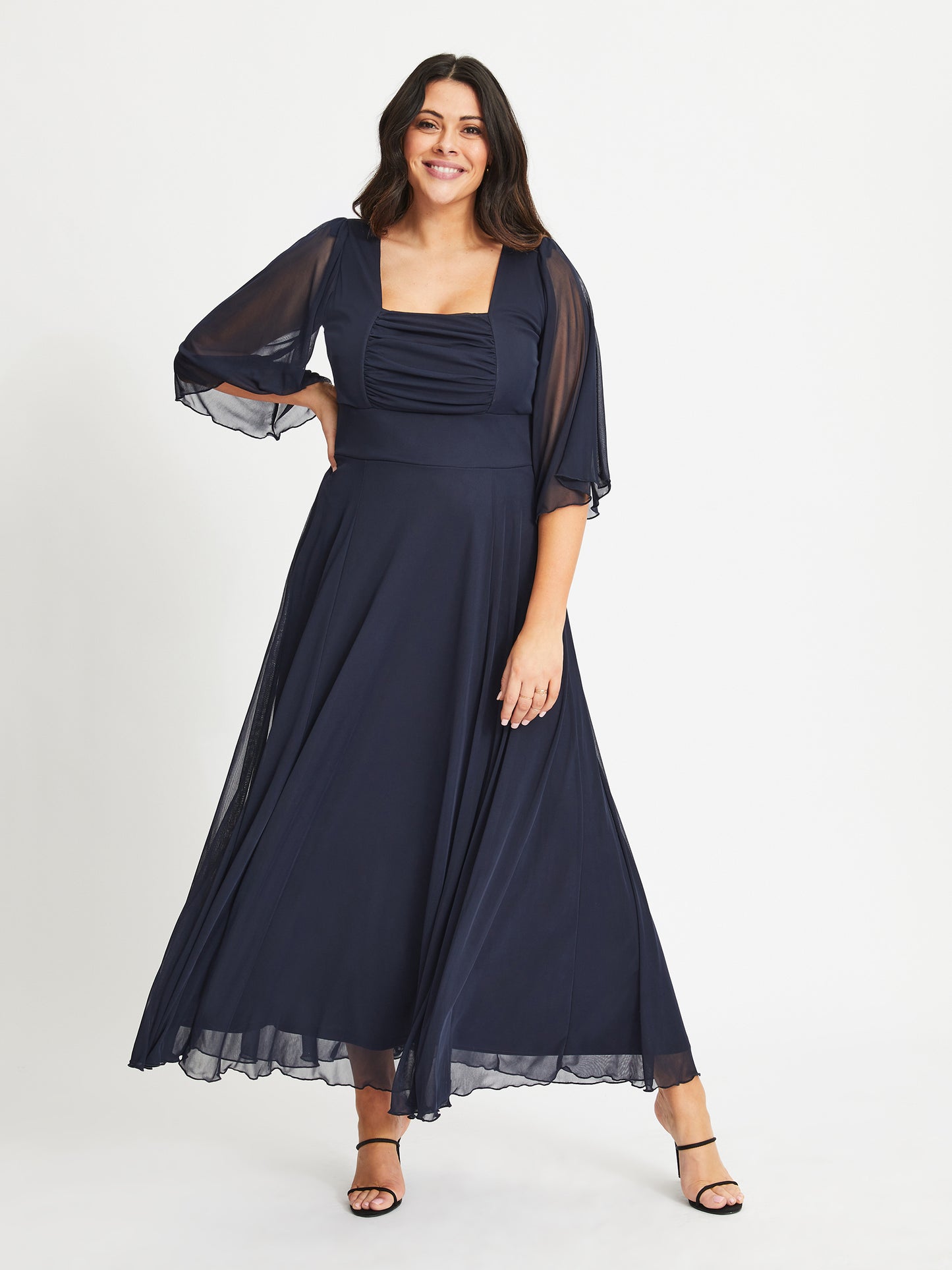 The Genie Navy Ruched Bodice Maxi Dress is complete with gently fluted sleeves. This beautiful dress is fully lined featuring a flattering square neck line and gathered bodice through to a magic inbuilt magic band waist that cinches you in and supports you into the unmistakable softly tailored Scarlett & Jo curve silhouette includes detachable shoulder pads.