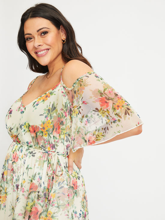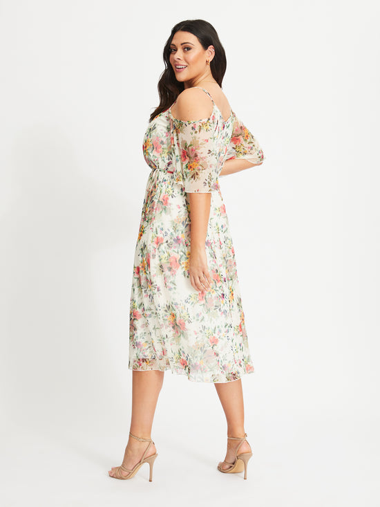 For a new level of elegance, opt for our newest floaty dress. Designed in a cold shoulder style and a self tie belt, this dress is a great addition for your wardrobe this season. Accented with a lace trim along front v neckline