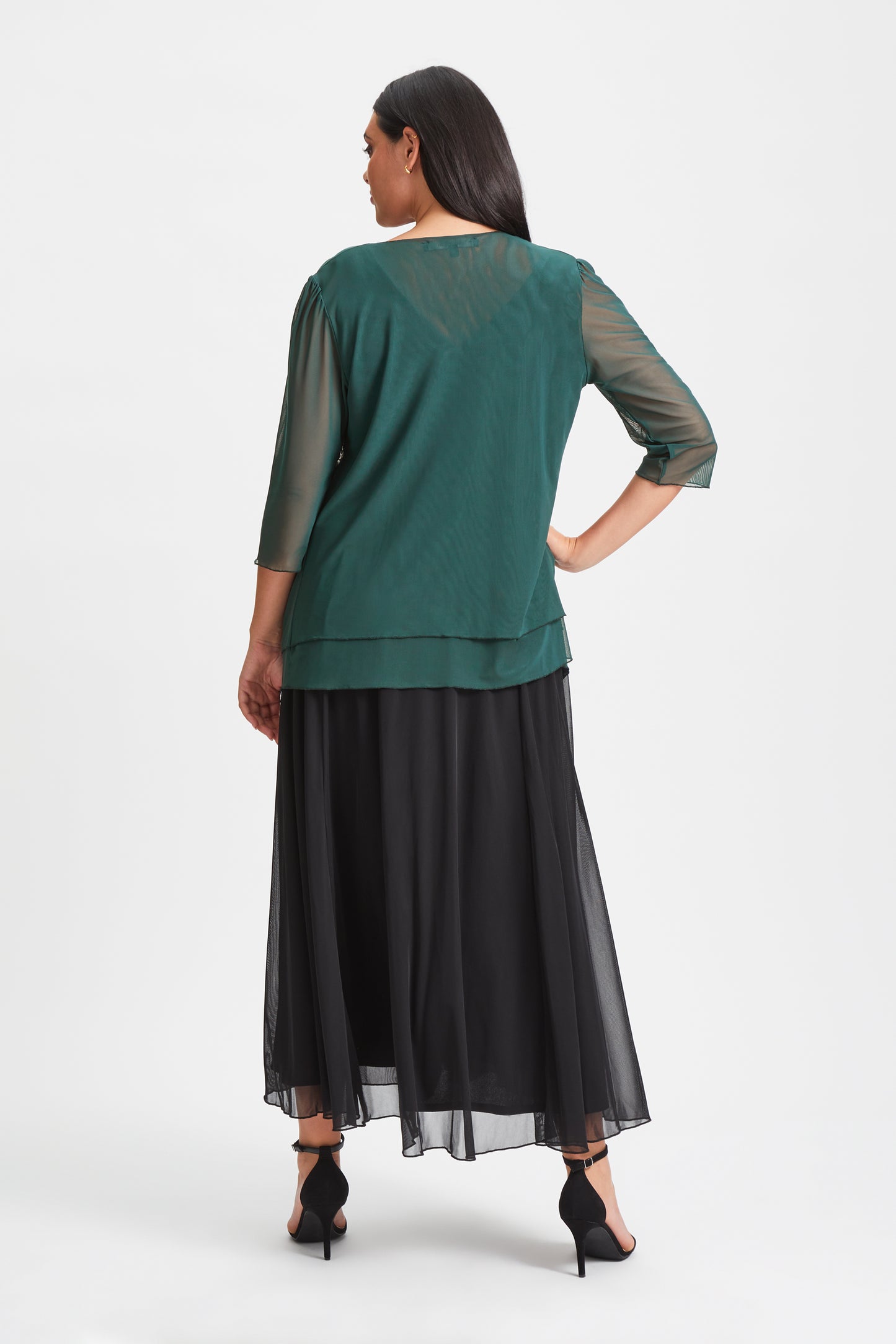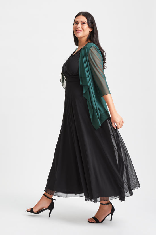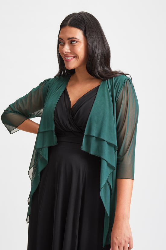 Softly structured, this piece is great for days and evenings when you need extra coverage. The layered waterfall shrug is perfect to wear with our sleeveless Nancy Marilyn dresses and similar styles. Made in a POWERFIT® mesh