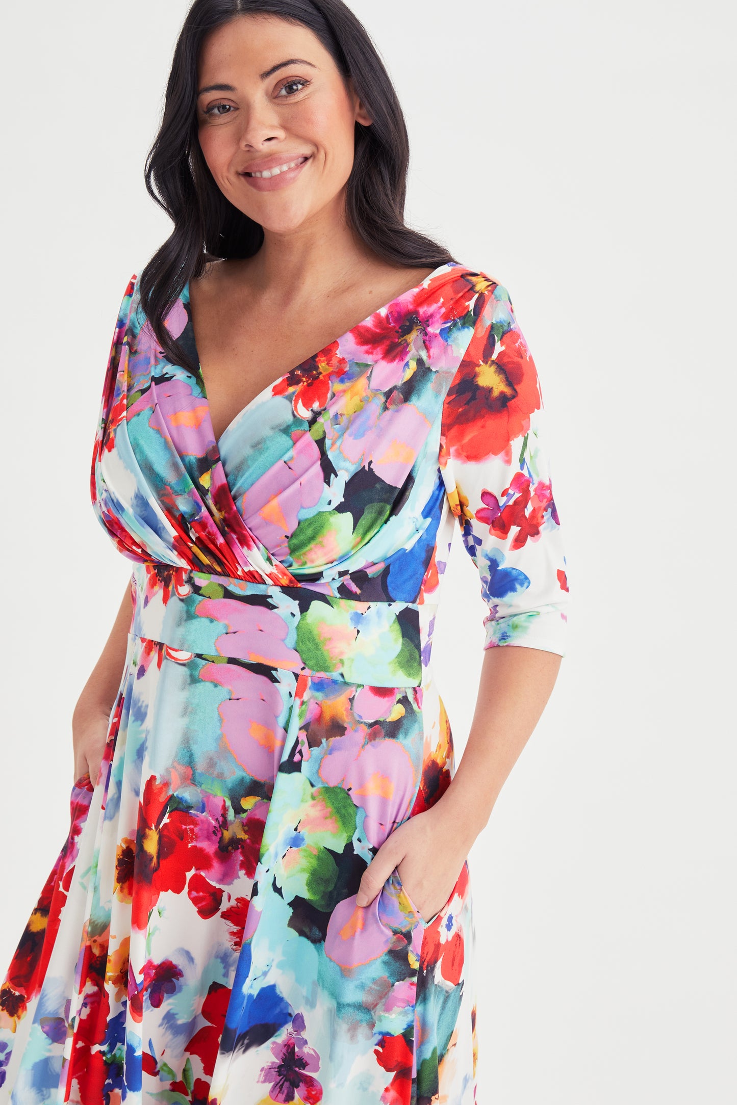 The Isabella Print 3/4 Sleeve Maxi Dress features a floral print on an ivory background. Made in our special "peach touch" supersoft and flowing jersey, this beautiful and really comfortable to wear dress features 3/4 sleeves, and a wrap V neckline. The elasticated magic waistband enhances your figure. Perfect for any occasion, this is a truly sensational maxi dress. Please note there are detachable shoulder pads that elongates as per your preference.