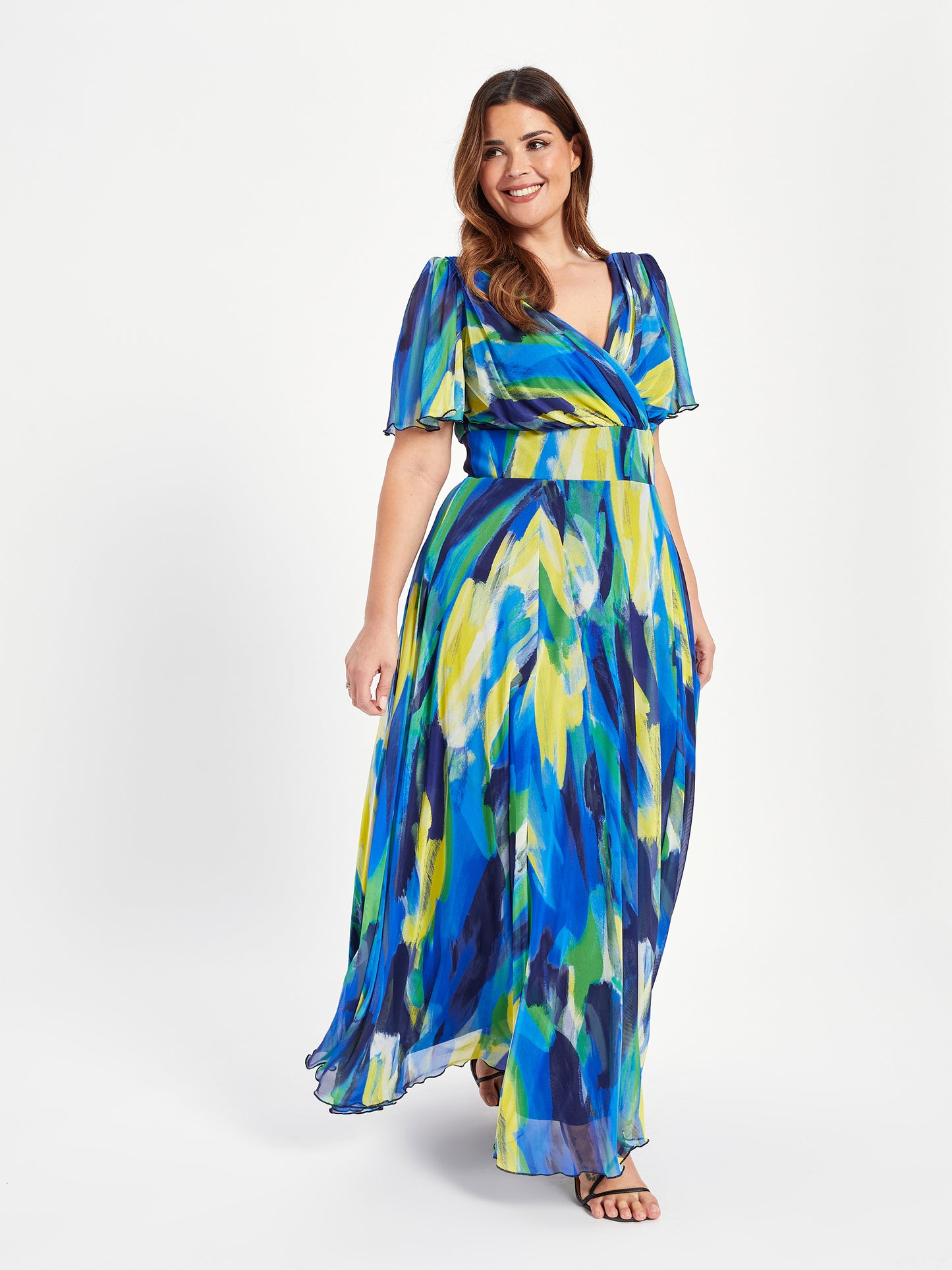 This Isabelle Float Sleeve Maxi Dress features a gorgeous graphic print of blues, yellows and greens on a predominantly blue background that the photos just can not capture. The dress is made in POWERFIT® soft mesh Featuring floaty angel sleeves, and a wrap V neckline. The elasticated MagicBand® enhances your figure. Perfect for any occasion, this is a truly sensational maxi dress. Please note there are detachable shoulder pads that elongates as per your preference.