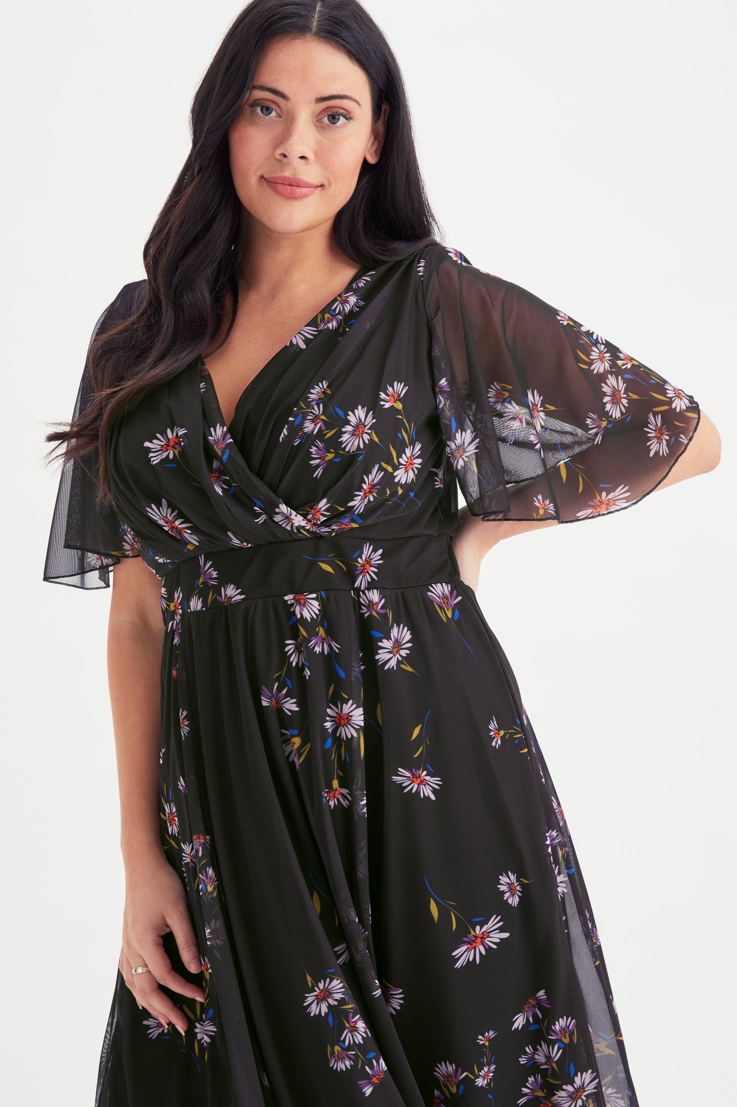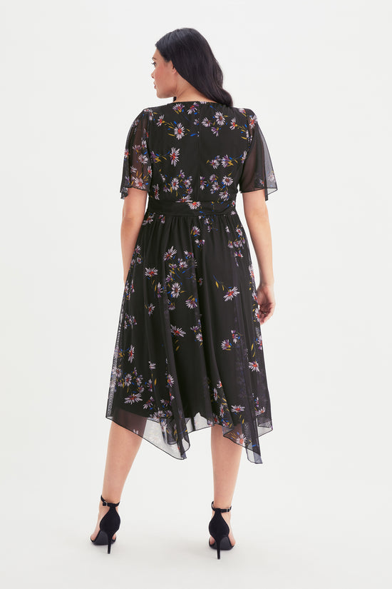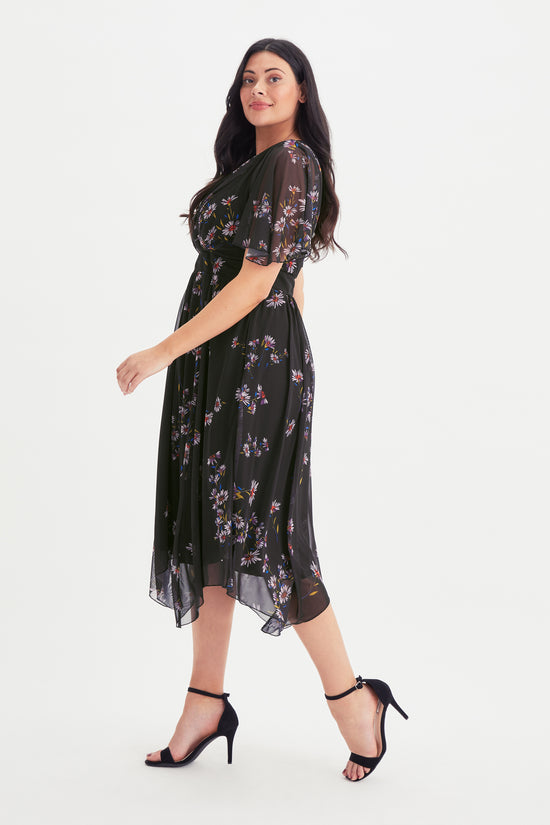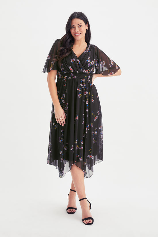 The Julie Black Multi Hanky Hem Dress is extraordinarily pretty black printed and fully lined dress. This dress is made in a super soft stretch POWERFIT® mesh, a fabric that breathes. The beautifully shaped crossover bodice together with a full handkerchief hem skirt elegantly falls at a midi length on taller ladies and maxi length for shorter ladies. Finished with a new flattering handkerchief sleeve and elasticated MagicBand® to cinch you in with that Scarlett & Jo signature shape.