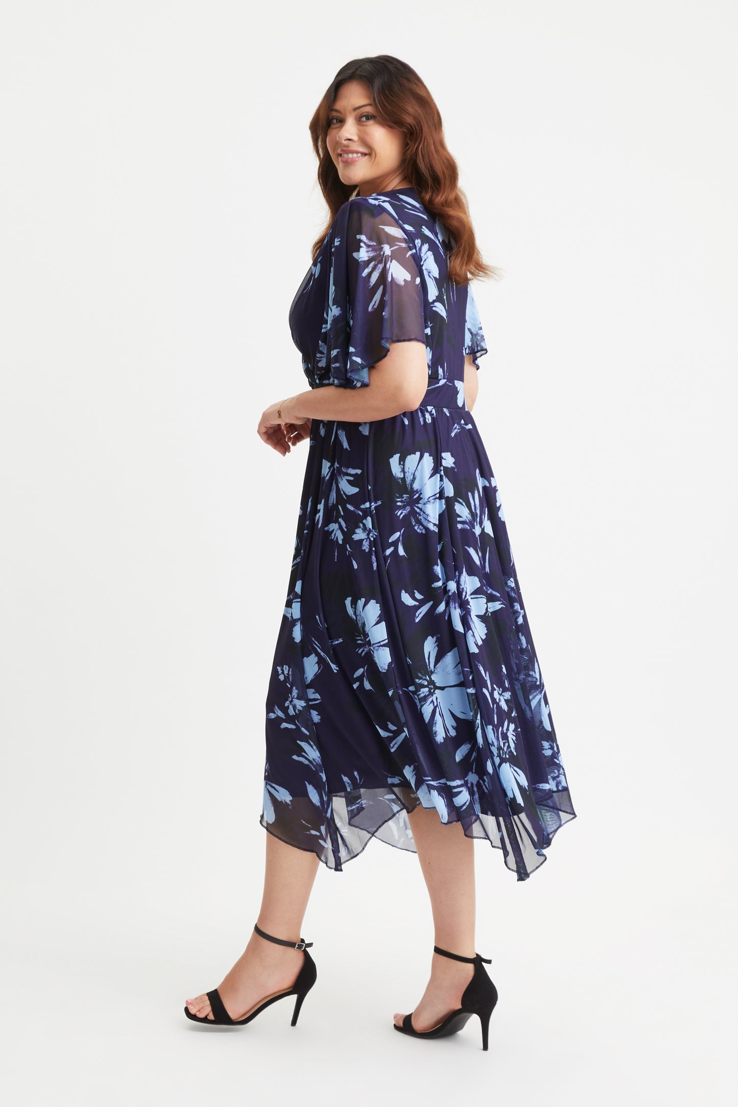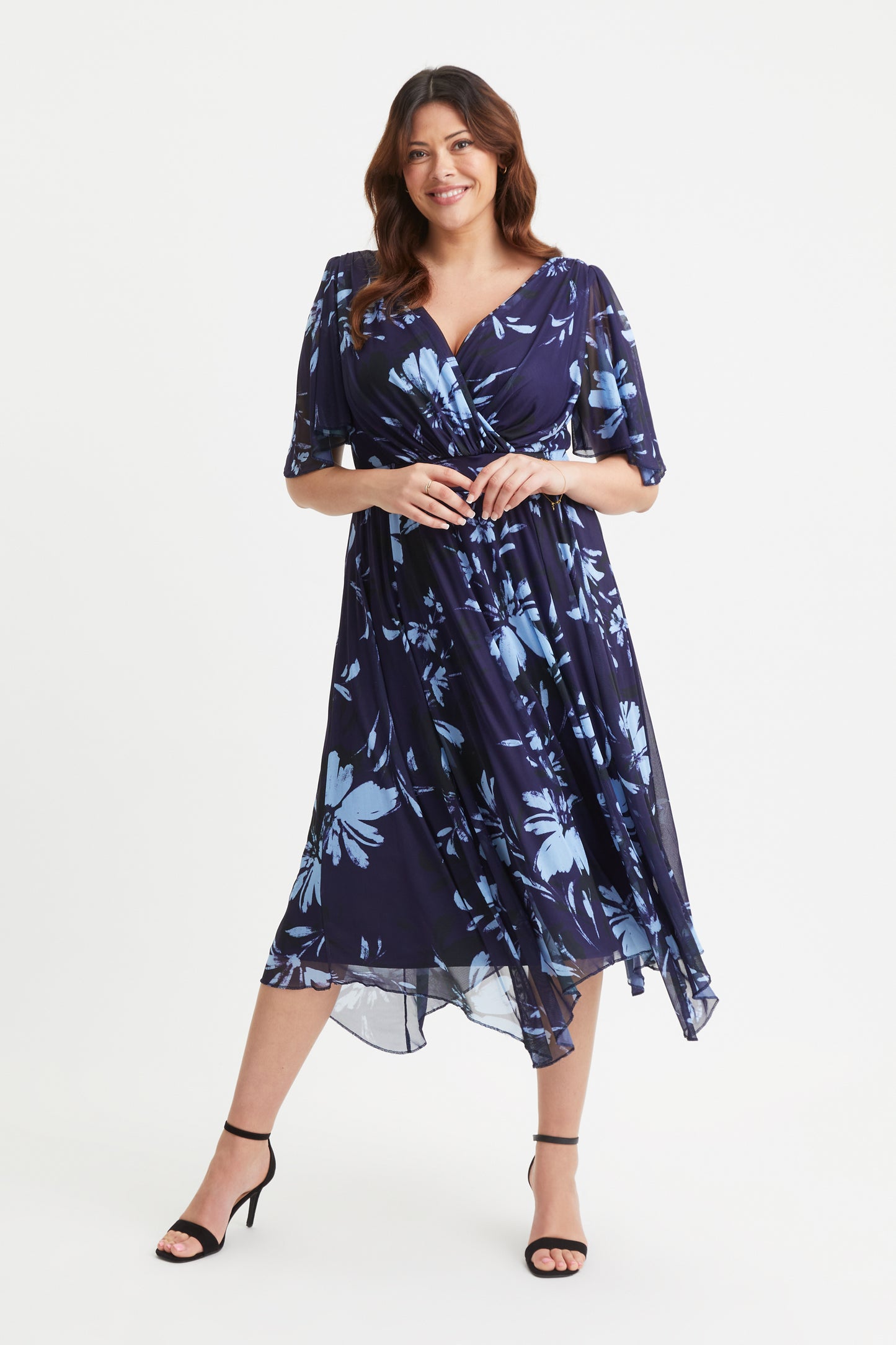 The Julie Navy Blue Hanky Hem Dress has an extraordinarily pretty navy blue print and fully lined dress. This dress is made in a super soft stretch POWERFIT® mesh, a fabric that breathes.  The beautifully shaped crossover bodice together with a full handkerchief hem skirt elegantly falls at a midi length on taller ladies and maxi length for shorter ladies. Finished with a new flattering handkerchief sleeve and elasticated MagicBand® to cinch you in with that Scarlett & Jo signature shape.