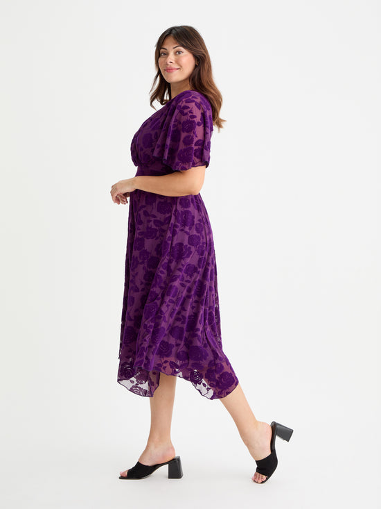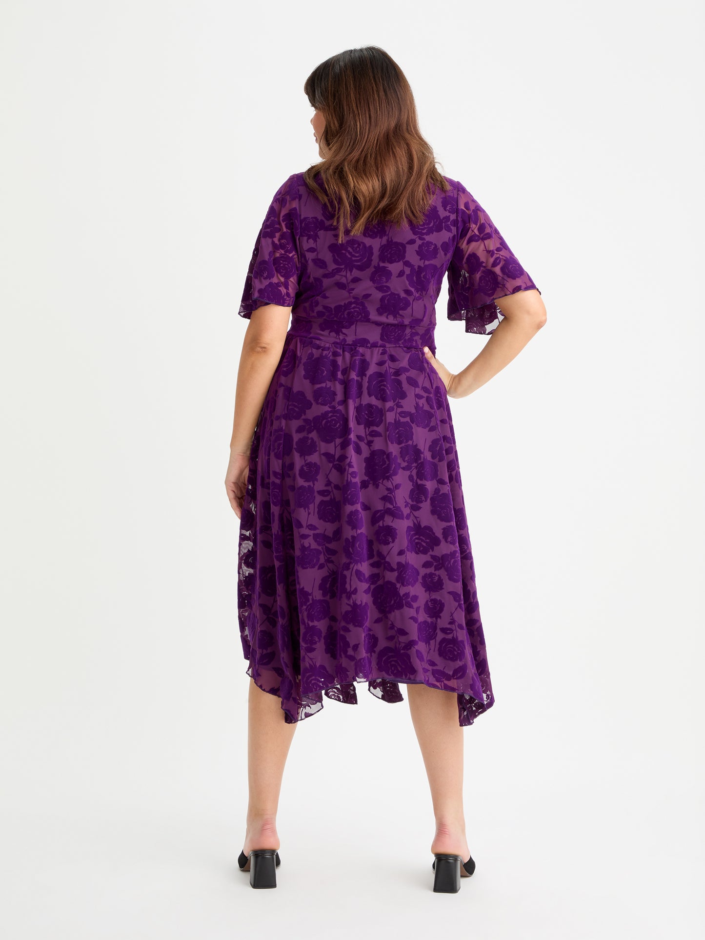 This is a fully lined dress and is crafted from a super soft stretch velvet flock mesh fabric. The beautifully shaped hanky hem dress features the Scarlett & Jo MagicBand® to great traditional effect. The crossover bodice together with a full hanky hem skirt elegantly falls at a midi length on taller ladies and almost maxi length for shorter ladies. Finished with a flattering handkerchief sleeve. A new Scarlett & Jo signature shape.