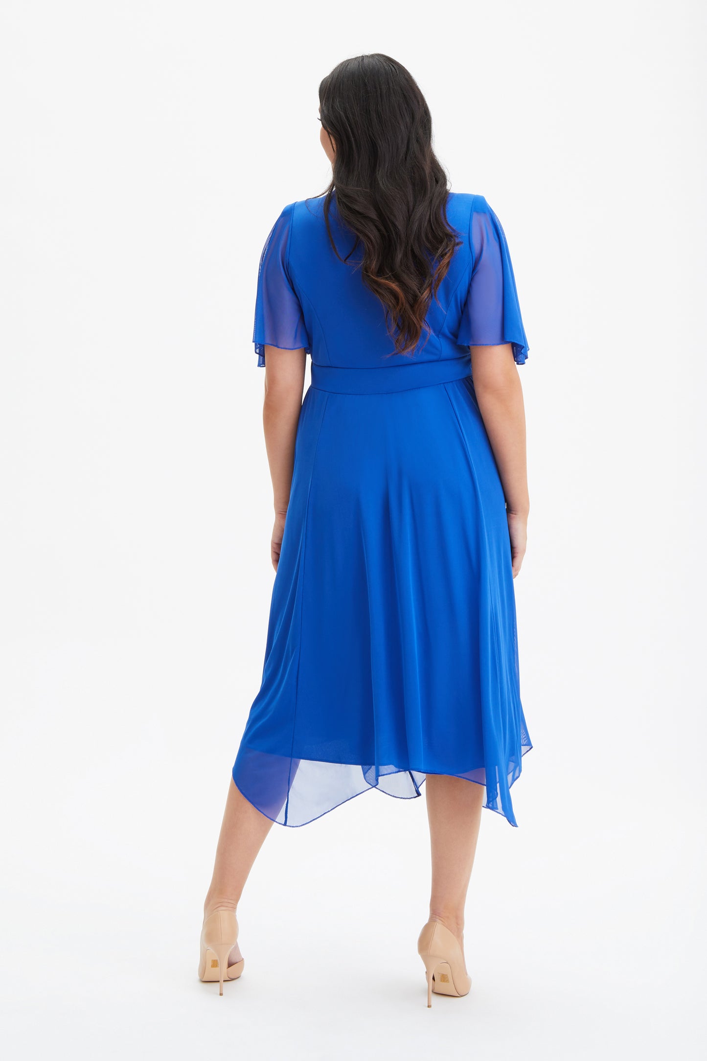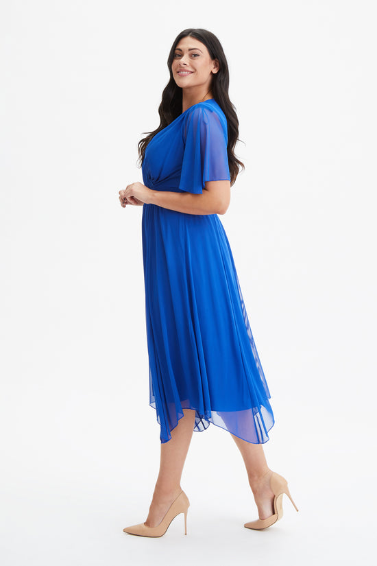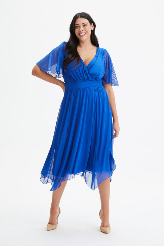 The Julie Cobalt Hanky Hem Dress has an extraordinarily pretty cobalt blue colour, and is a fully lined dress. This dress is made in a super soft stretch POWERFIT® mesh, a fabric that breathes. The beautifully shaped crossover bodice together with a full handkerchief hem skirt elegantly falls at a midi length on taller ladies and maxi length for petite ladies. Finished with a new flattering handkerchief sleeve and elasticated MagicBand® to cinch you in with that Scarlett & Jo signature shape.
