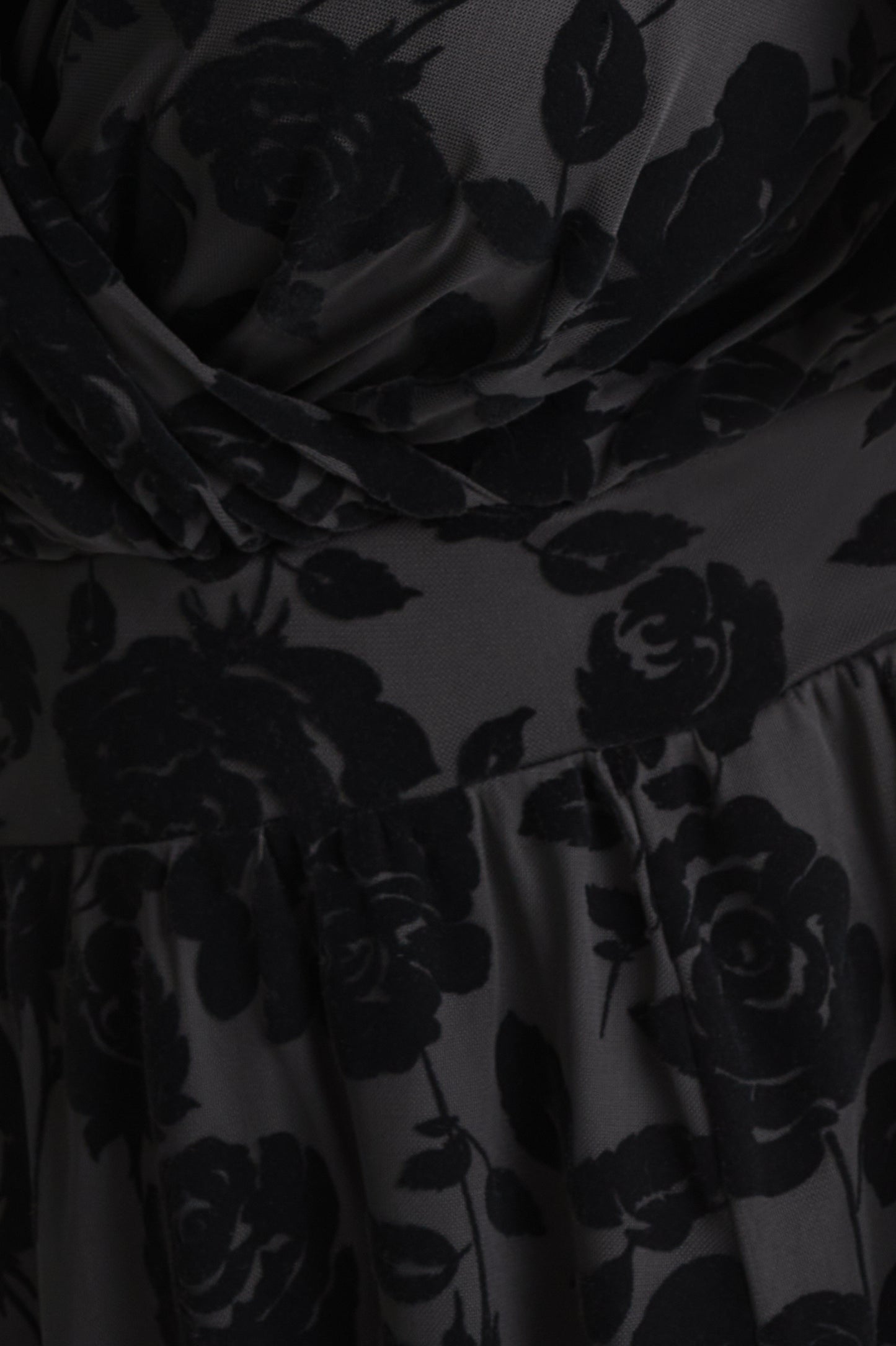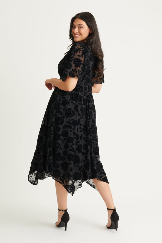 This is a fully lined dress and is crafted from a super soft stretch velvet flock mesh fabric. The beautifully shaped hanky hem dress features the Scarlett & Jo MagicBand™ to great traditional effect. The crossover bodice together with a full hanky hem skirt elegantly falls at a midi length on taller ladies and almost maxi length for shorter ladies. Finished with a flattering handkerchief sleeve. A new Scarlett & Jo signature shape.