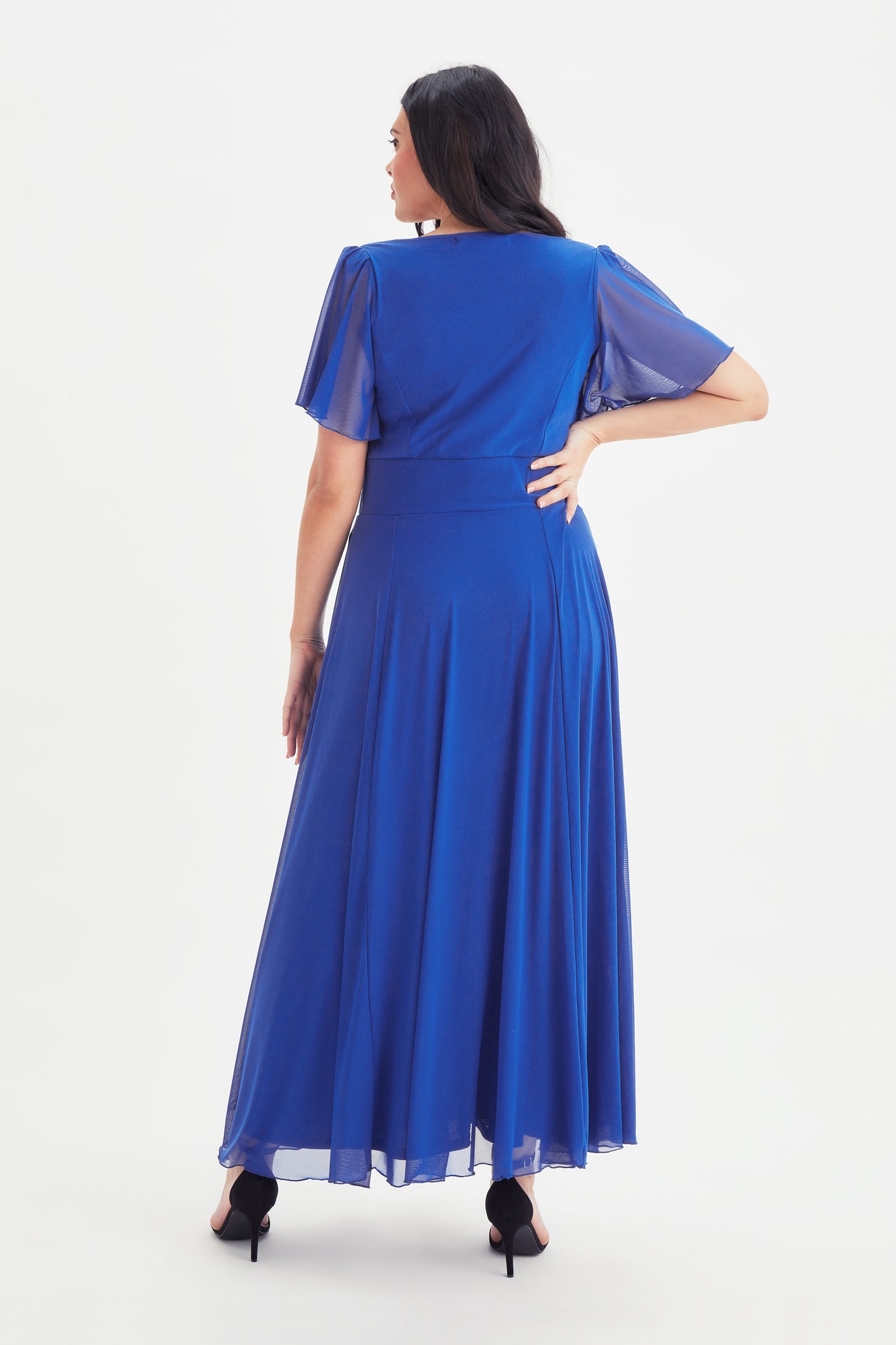 The Kemi Bright Blue Bolero Wrap Bodice Maxi Gown features a gorgeous, daring low-cut, wrap bodice featuring floaty angel sleeves, and a sweetheart neckline. The elasticated magic waistband enhances your figure. Perfect for any occasion, this is a truly sensational maxi dress with wrap sweetheart neck line. Please note there are detachable shoulder pads that elongates as per your preference.