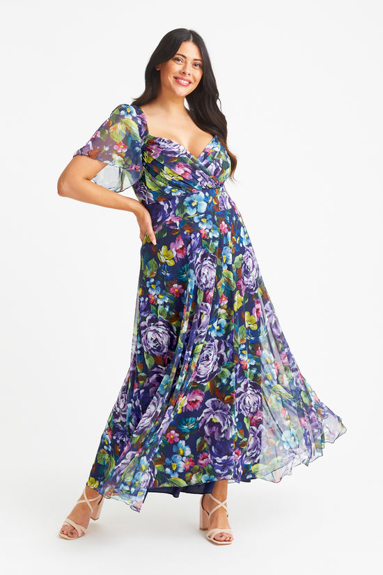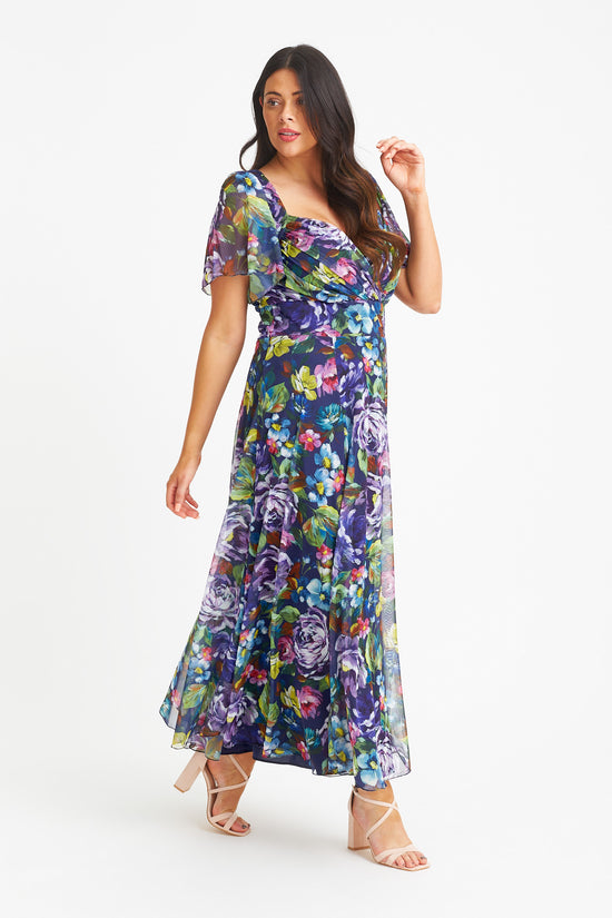 The Kemi Navy Purple Print Bolero Wrap Bodice Maxi Gown features a gorgeous, daring low-cut, wrap bodice adorned with a navy purple print that the photos just can not capture. Featuring floaty angel sleeves, and a sweetheart neckline. The elasticated magic waistband enhances your figure. Perfect for any occasion, this is a truly sensational maxi dress with wrap sweetheart neck line. Please note there are detachable shoulder pads that elongates as per your preference.