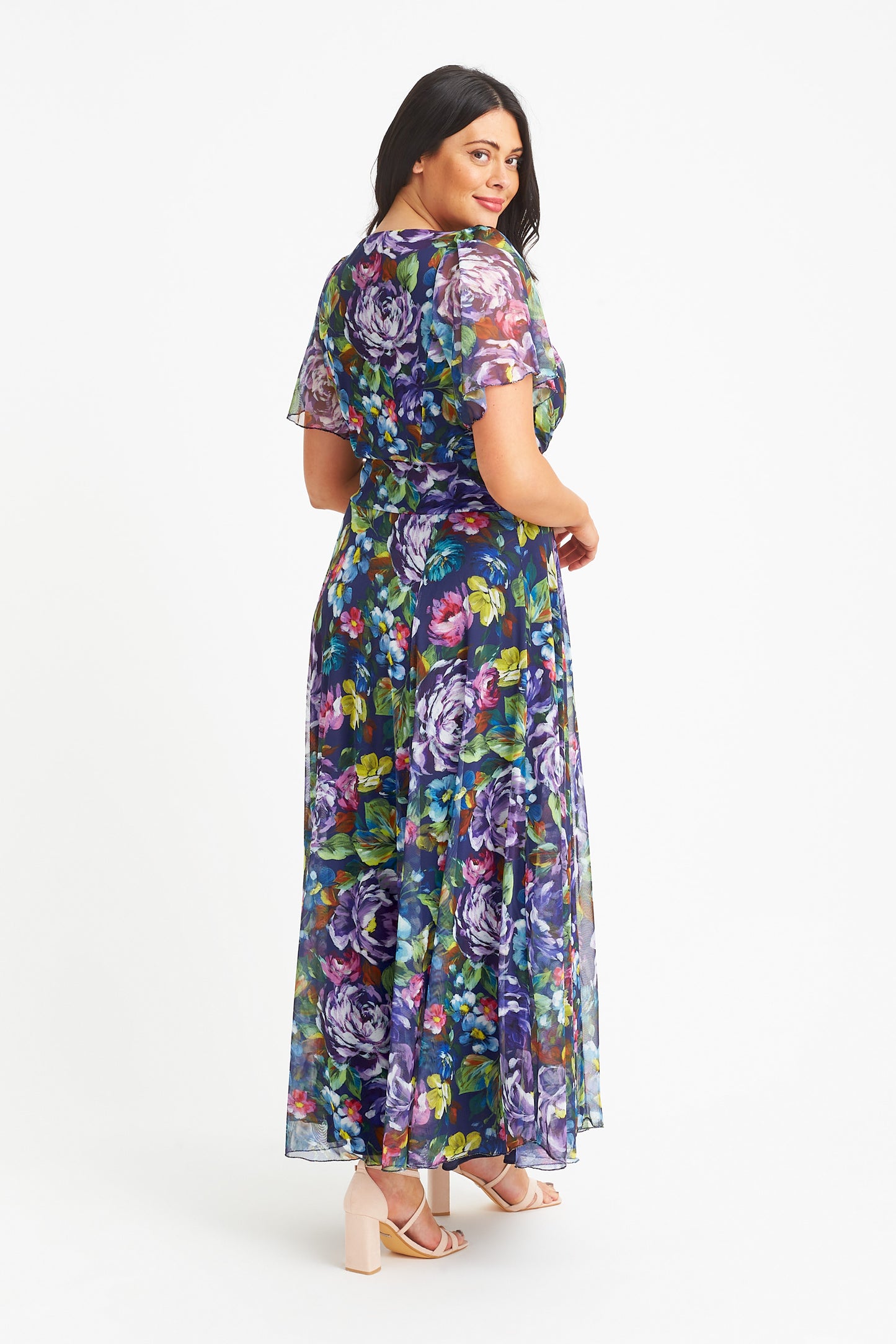 Kemi Navy Purple Print Bolero Wrap Bodice Maxi Gown