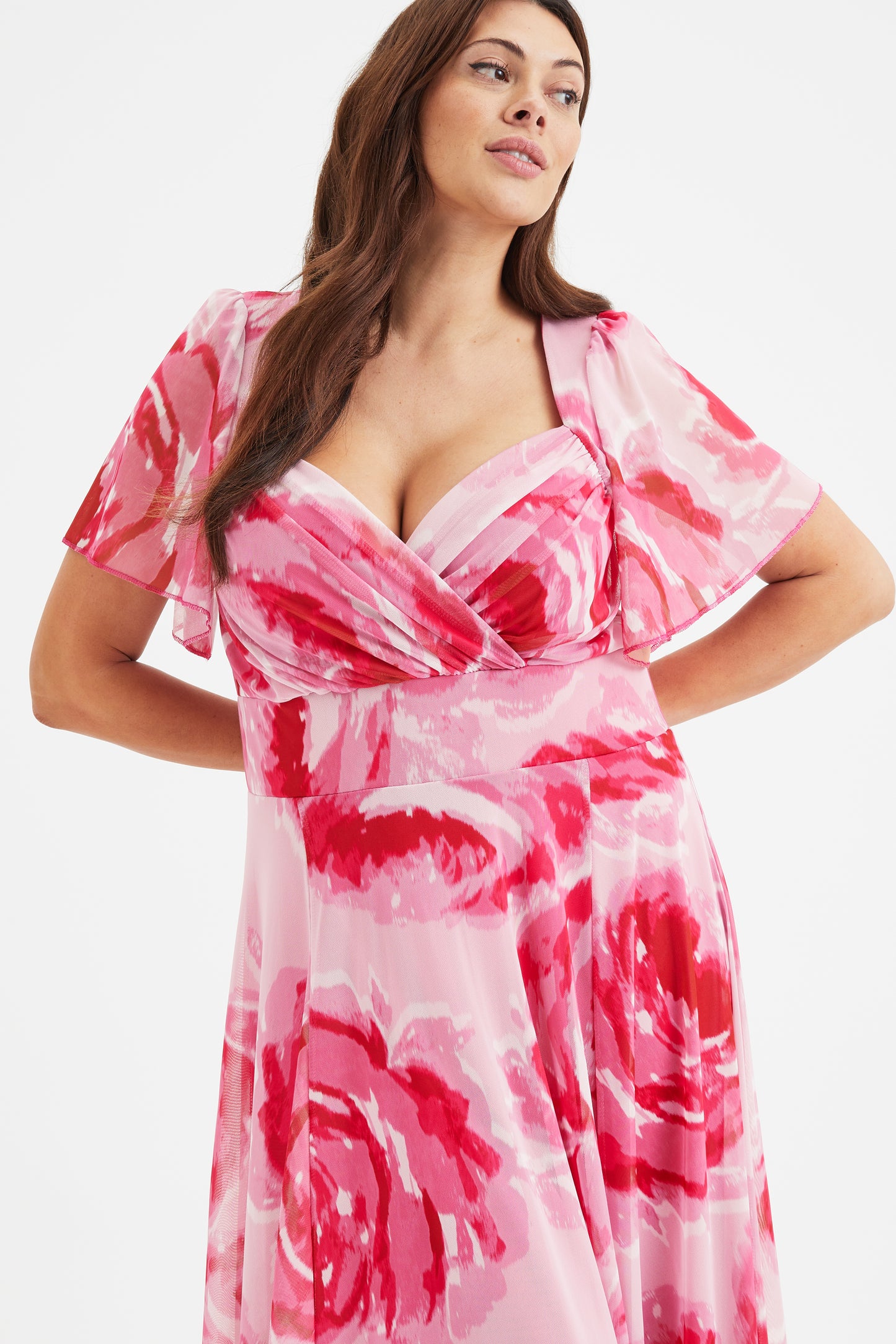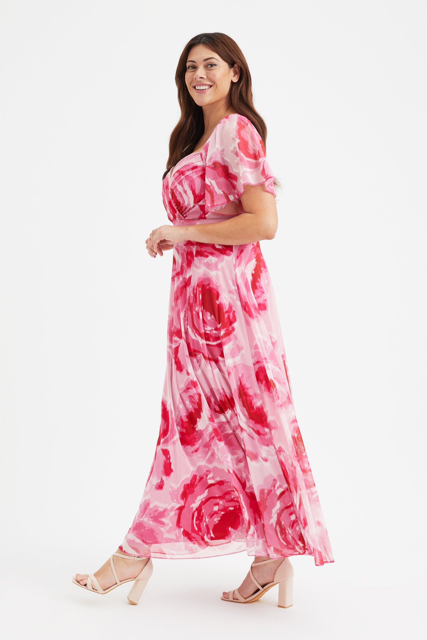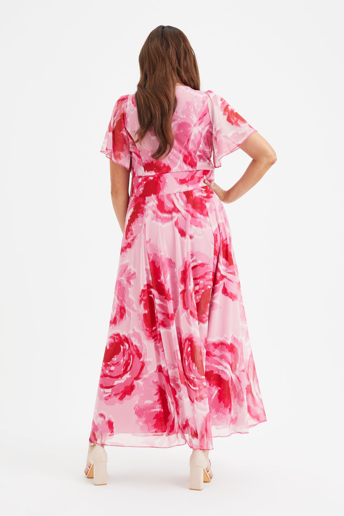 The Kemi Pink Rose Print Bolero Wrap Bodice Maxi Gown features a gorgeous, daring low-cut, wrap bodice adorned with a pink rose print that the photos just can not capture. Printed on Scarlett & Jo POWERFIT soft stretch mesh. This dress features floaty angel sleeves, and a sweetheart neckline. The elasticated Magicband enhances your figure. Perfect for any occasion, this is a truly sensational fully lined maxi dress with wrap sweetheart neck line . Please note there are detachable shoulder pads that elongates as per your preference.