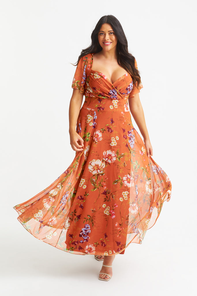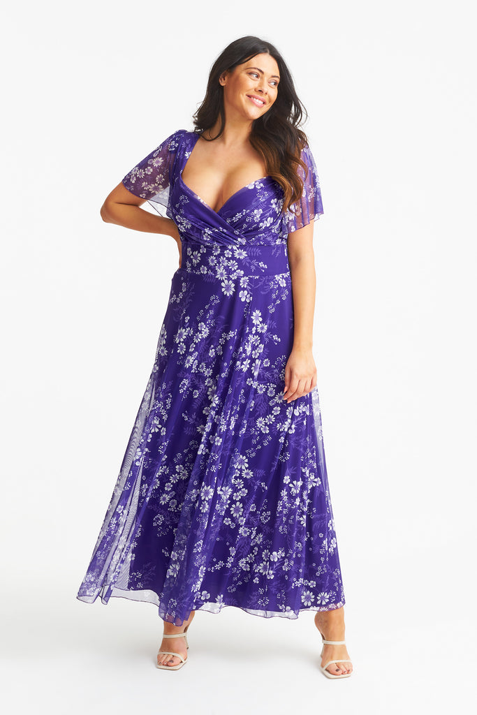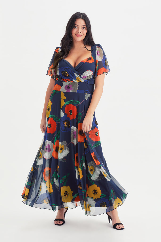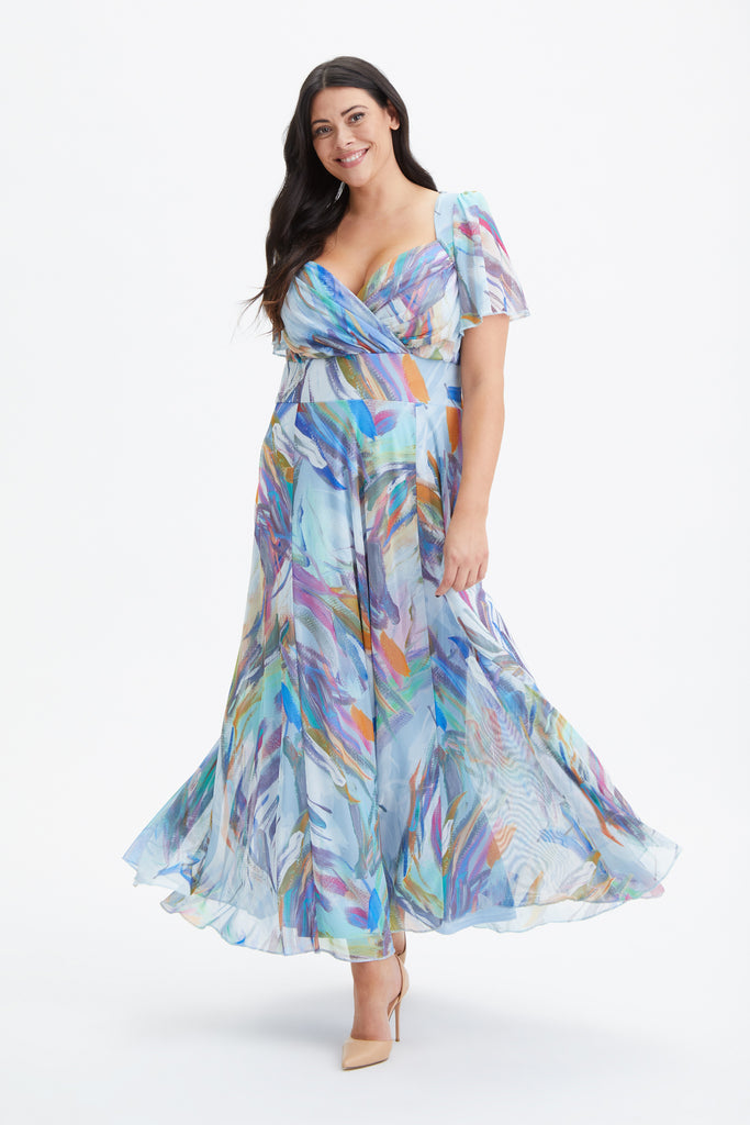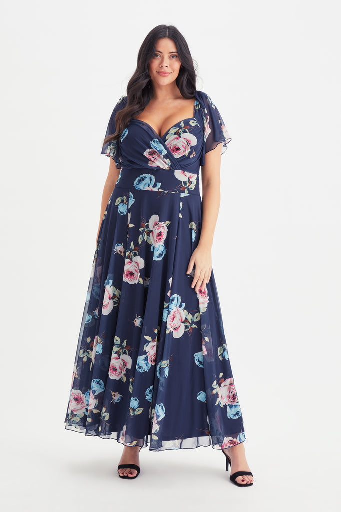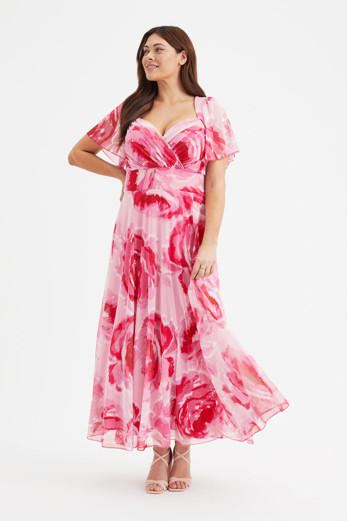 The Kemi Pink Rose Print Bolero Wrap Bodice Maxi Gown features a gorgeous, daring low-cut, wrap bodice adorned with a pink rose print that the photos just can not capture. Printed on Scarlett & Jo POWERFIT soft stretch mesh. This dress features floaty angel sleeves, and a sweetheart neckline. The elasticated Magicband enhances your figure. Perfect for any occasion, this is a truly sensational fully lined maxi dress with wrap sweetheart neck line . Please note there are detachable shoulder pads that elongates as per your preference.