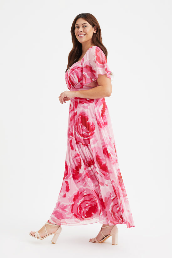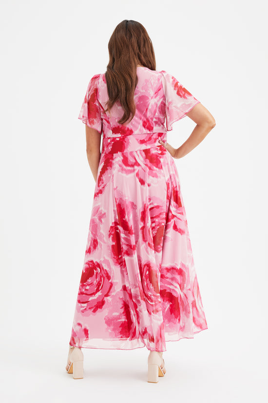 Kemi Pink Rose Print Bolero Wrap Bodice Maxi Gown